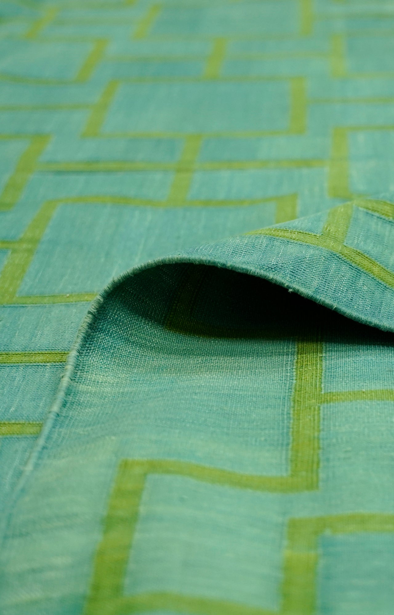 This rug showcases an intricate lattice of overlapping squares in fresh shades of turquoise and green, creating a refined geometric pattern that feels both modern and timeless. The subtle tonal variations in the flatweave give it a soft, luminous look, making it ideal for brightening contemporary living rooms, dining spaces, or creative studios with a calm yet stylish statement.