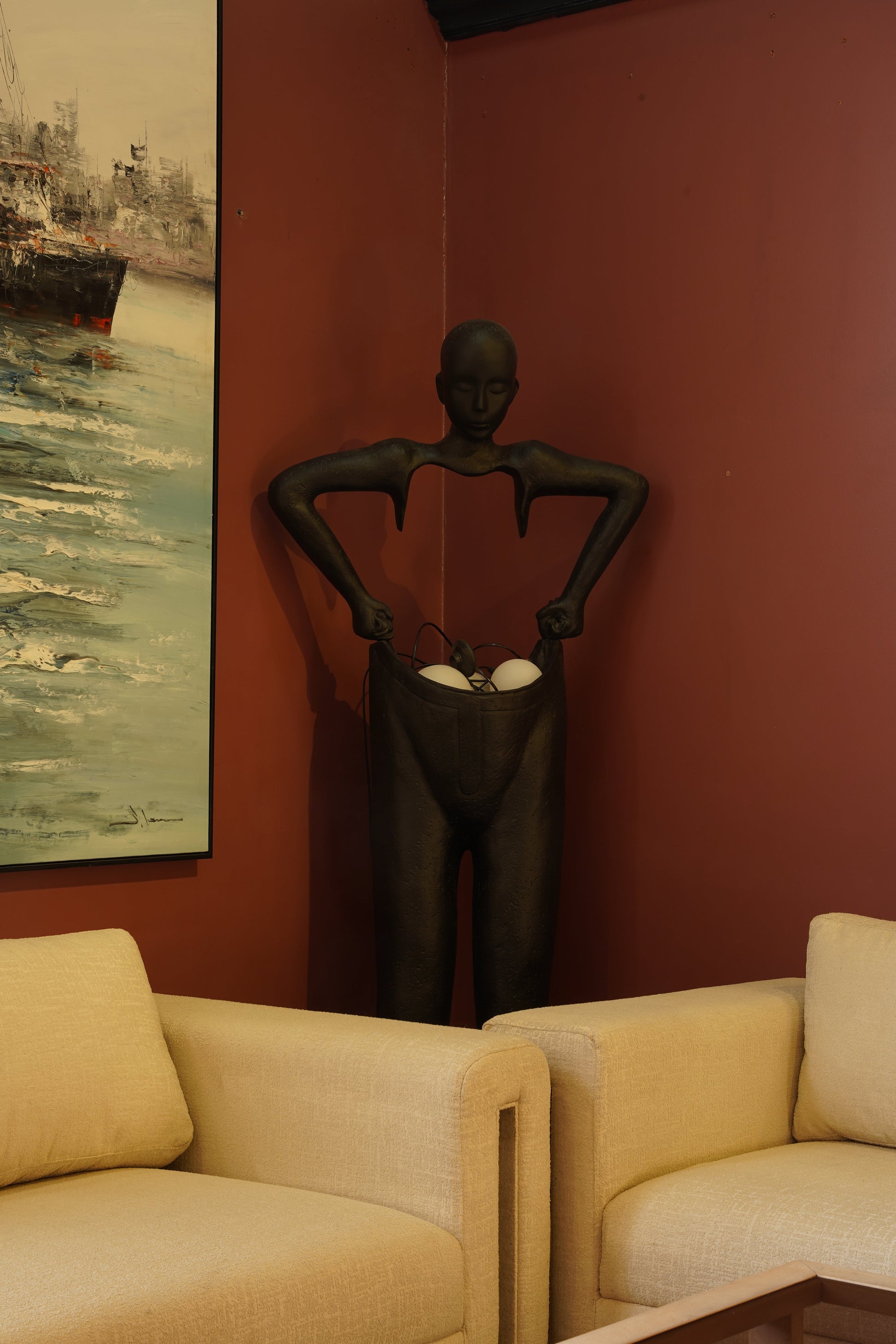 This resin floor lamp features a striking sculpture with an abstract figure, finished in matte dark tones. The figure stands upright with arms raised, holding the sides of its abdomen. Within the hollowed section of the figure are the white orbs, which serve as the light sources. The contrast between the smooth, polished surface of the figure and the illuminated orbs creates a modern, whimsical look, offering both artistic flair and functional lighting.