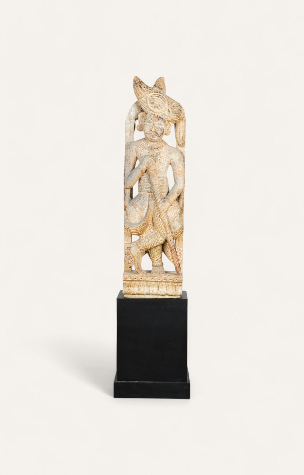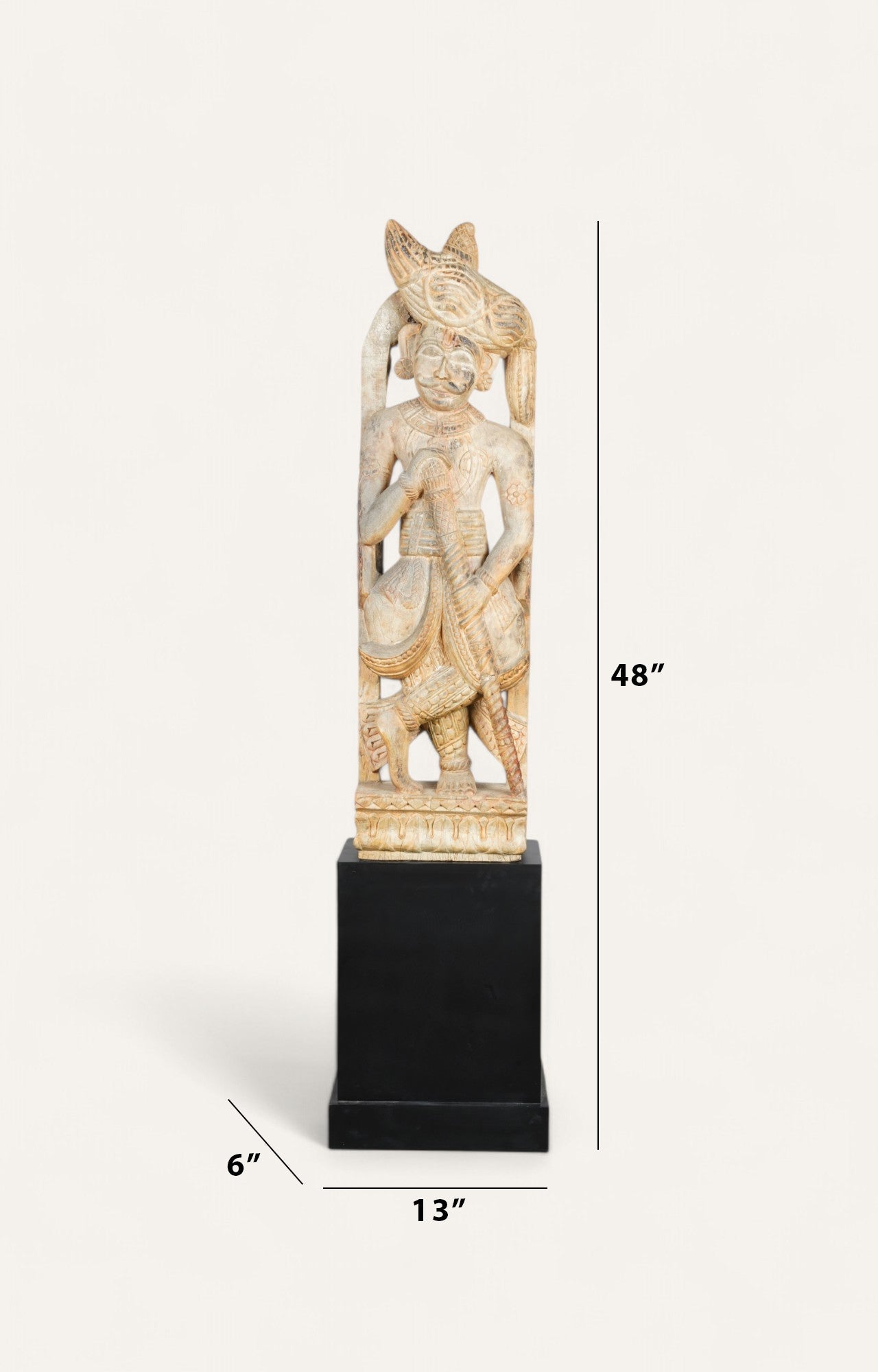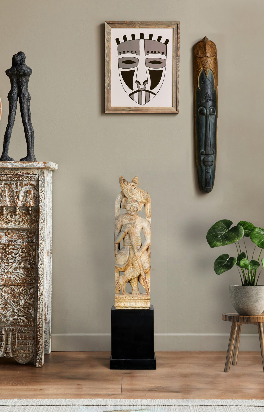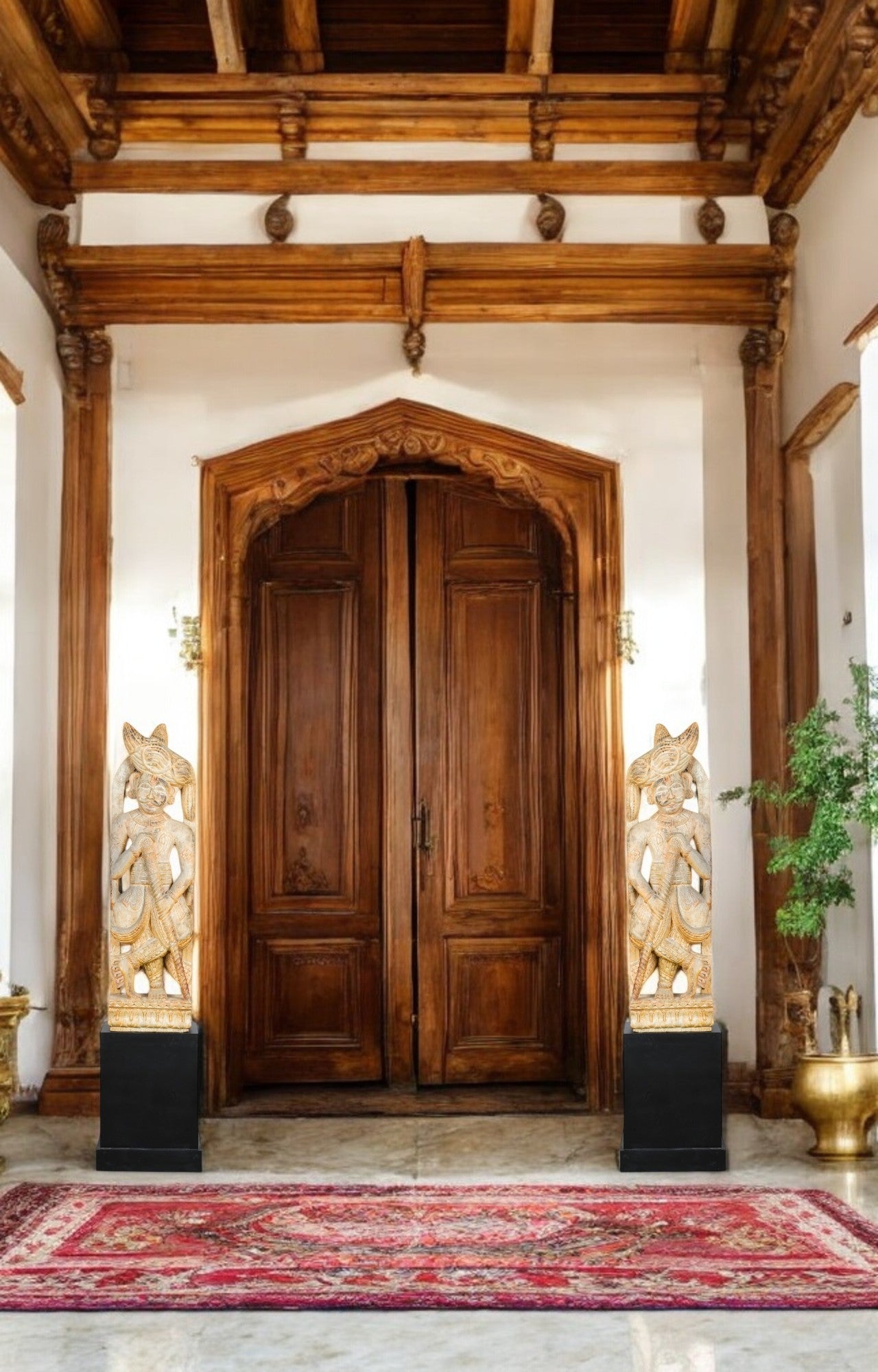 This giant, slender Dwarpal statue is a beautiful blend of abstraction and heritage. Carved from high-quality teak wood, the figurine stands with immense power and authority on a solid base, representing the guarding spirit of traditional Indian gateways. If you also believe in the idea of less is more, then this can be an ideal art creation for you. With minimal design and impactful elements, this is a perfect space-saving piece for vertical display and suits both vintage and modern interiors. Use it as a traditional decorative showpiece or spiritual accent in your entrance, hallway, or living area. Additional Highlight: Space-saving tall format for vertical display