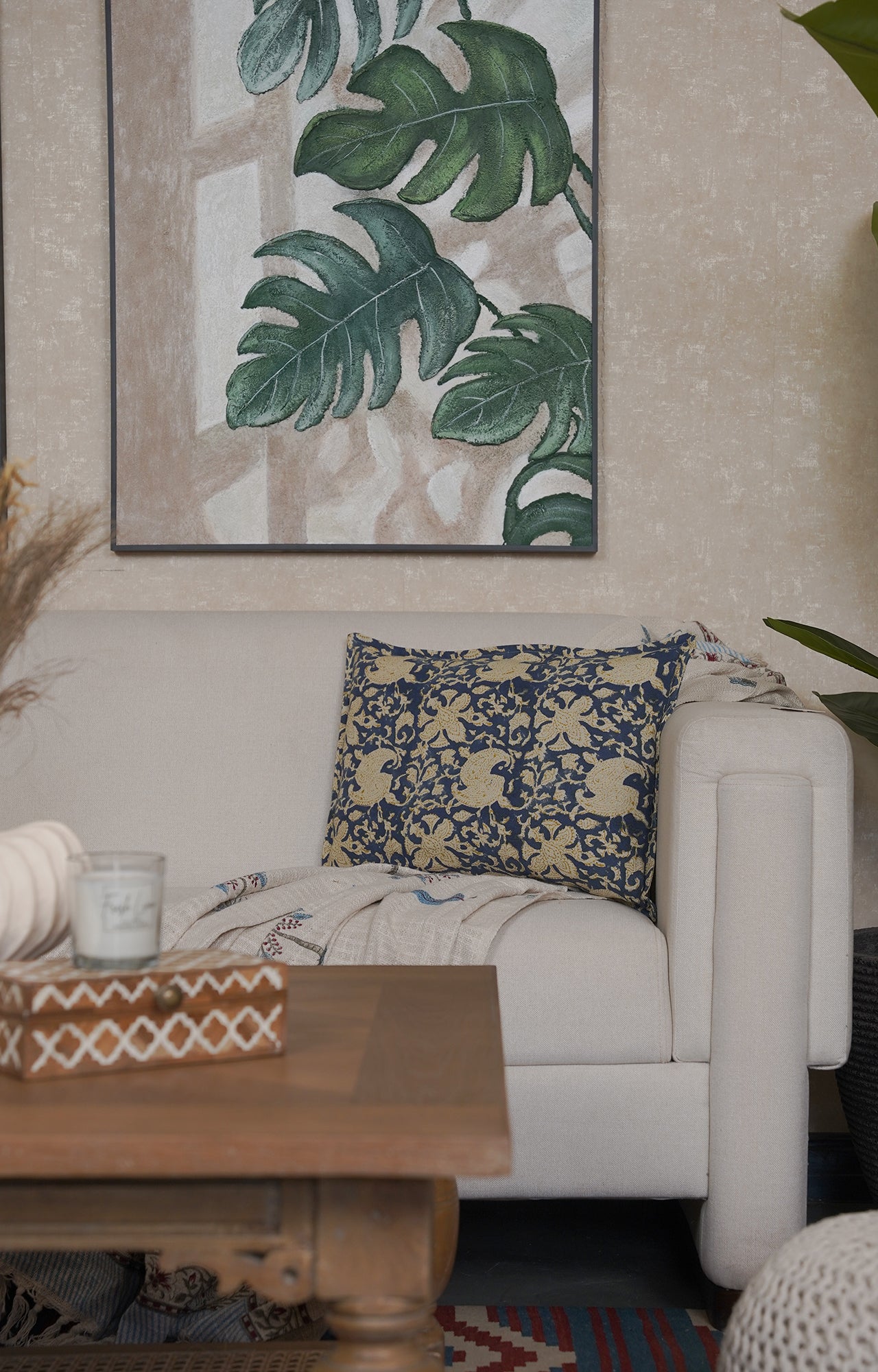 Botanical drama abounds beautifully in this rectangular cotton cushion cover. With a detailed Jacobean-style floral design in muted gold hue, it is an accent cover on a dark indigo background. Add this statement piece for maximalist spaces or as a high-end accent on a neutral couch.