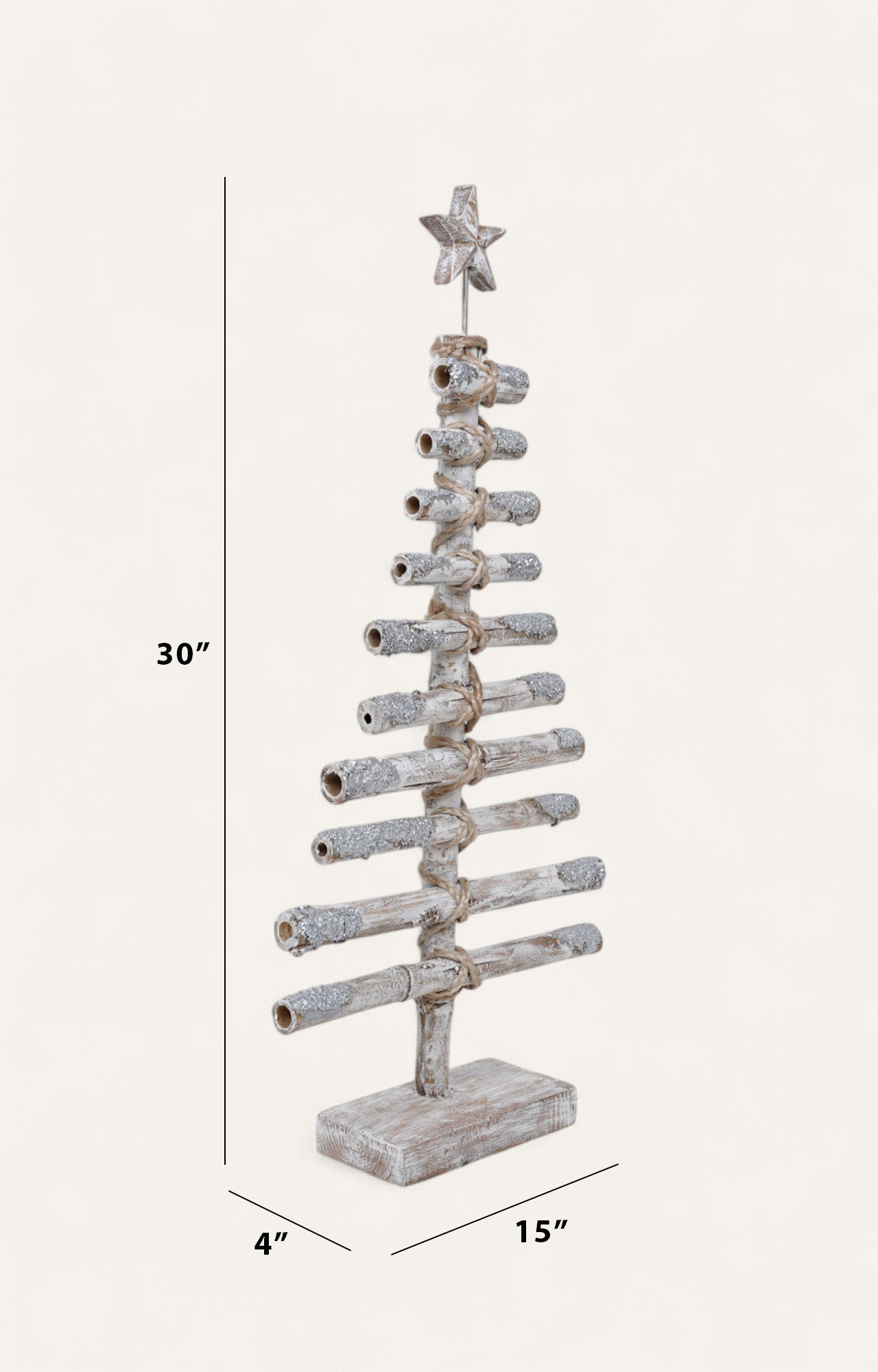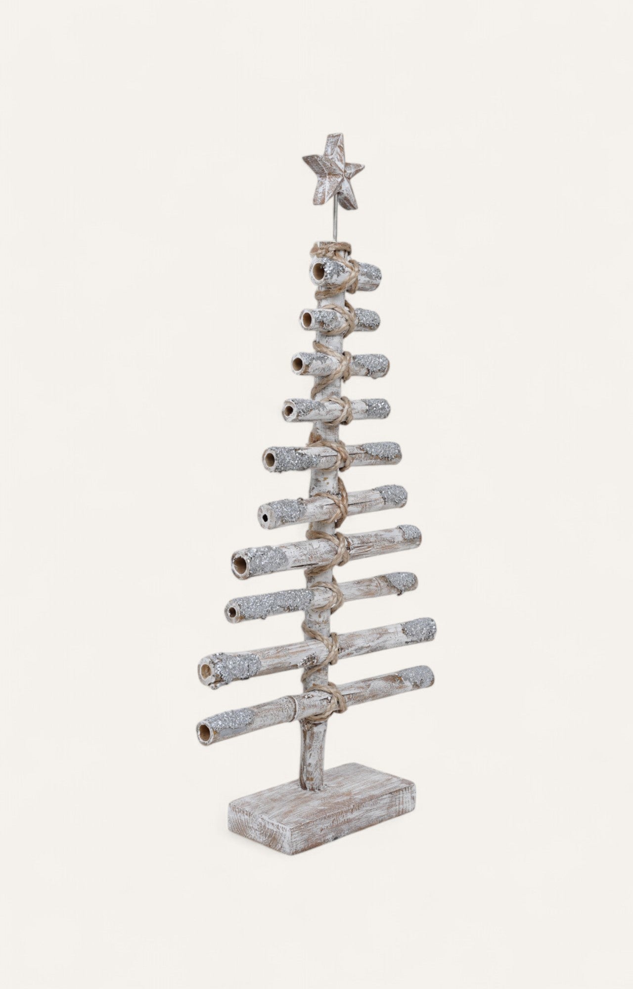 This charming wooden Christmas tree is a unique and elegant addition to your holiday decor. Crafted from weathered wood and accented with a jute rope and a sparkling star, it adds a touch of vintage charm and festive cheer. This decorative piece is perfect for displaying on a tabletop or mantelpiece, creating a warm and inviting holiday atmosphere.