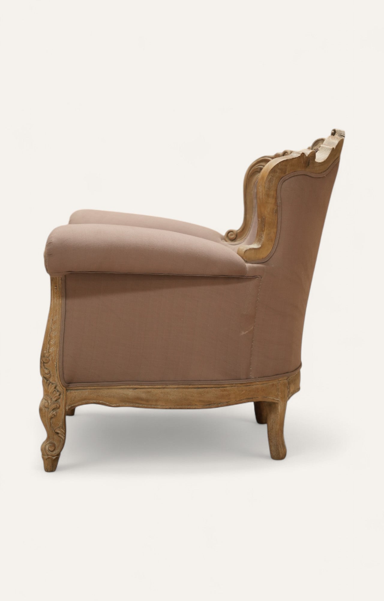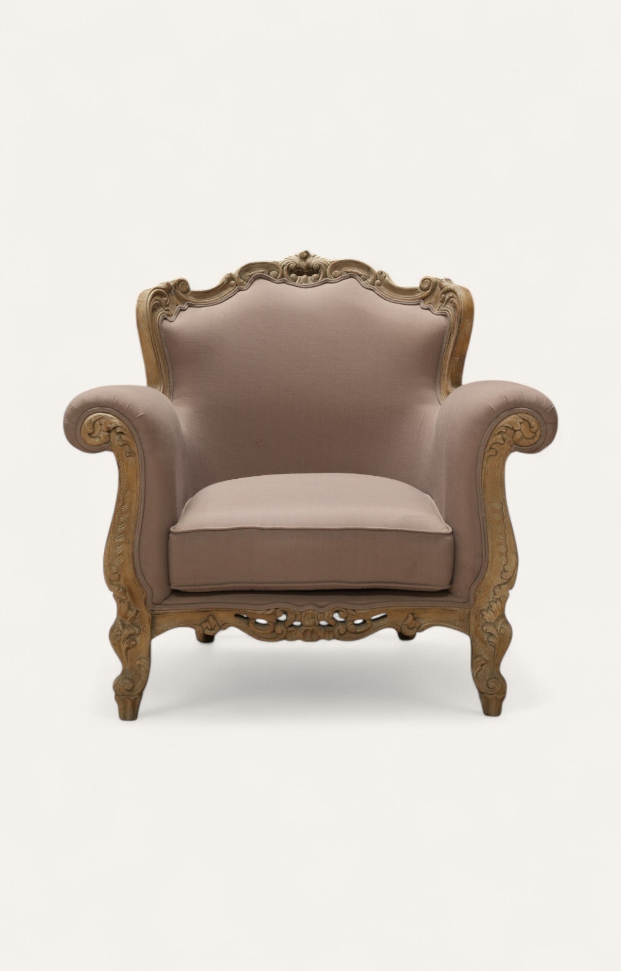 This armchair captures the essence of classic French style with its delicately carved acacia wood frame and lavish velvet upholstery. While the natural finish and gentle curves bring refinement, the deep seat provides enduring comfort. Ideal as a wooden reading armchair or a statement piece in a living room.