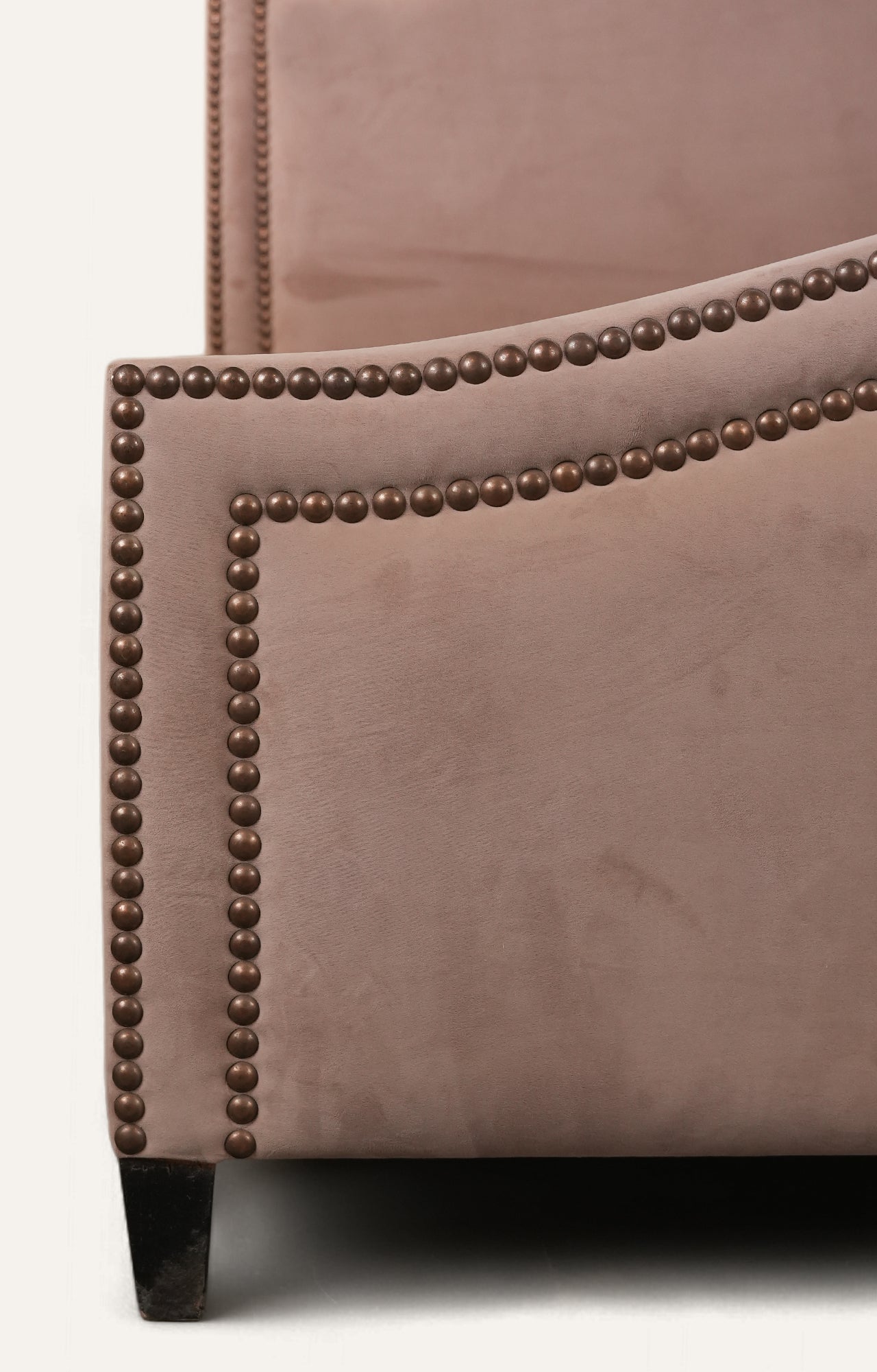 This elegantly curved bed combines modern comfort with classic finesse, featuring a solid acacia wood structure upholstered in luxuriously soft velvet. Both the headboard and footboard are accented with hand-applied brass nailhead trim, adding a distinguished touch and refined texture to the silhouette. The gentle arching lines produce a sense of calm and sophistication, while the plush upholstery ensures a cozy and inviting presence in any bedroom setting.