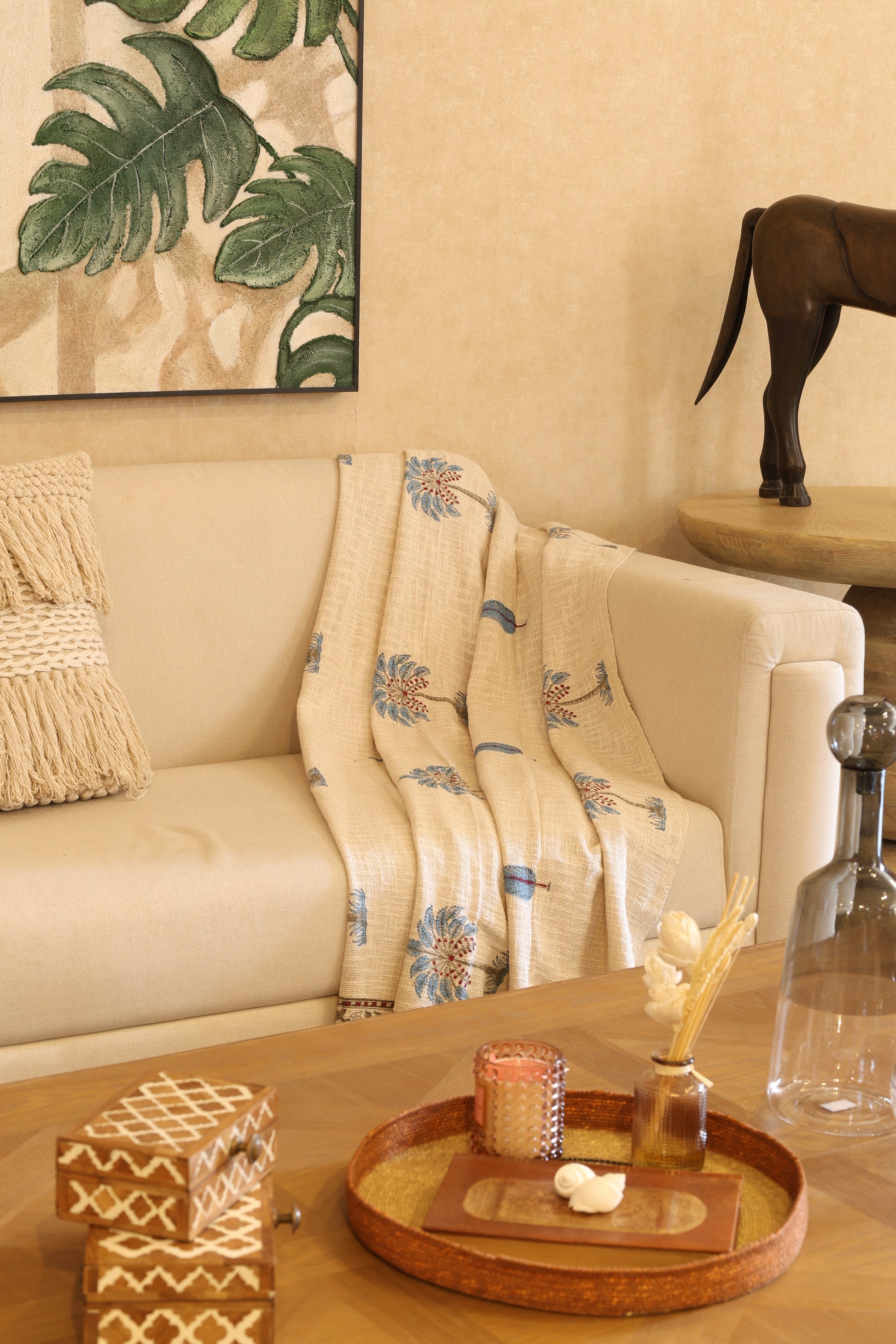This white cotton throw features calming blue tree and leaf motifs, bringing a peaceful, nature-inspired touch to your space. The delicate block print design adds a handcrafted charm, perfect for adding style to your sofa or bed. Made from soft, breathable cotton, it offers comfort and lightness for all seasons. Easy to maintain, it’s an effortless way to refresh your room with a serene vibe.