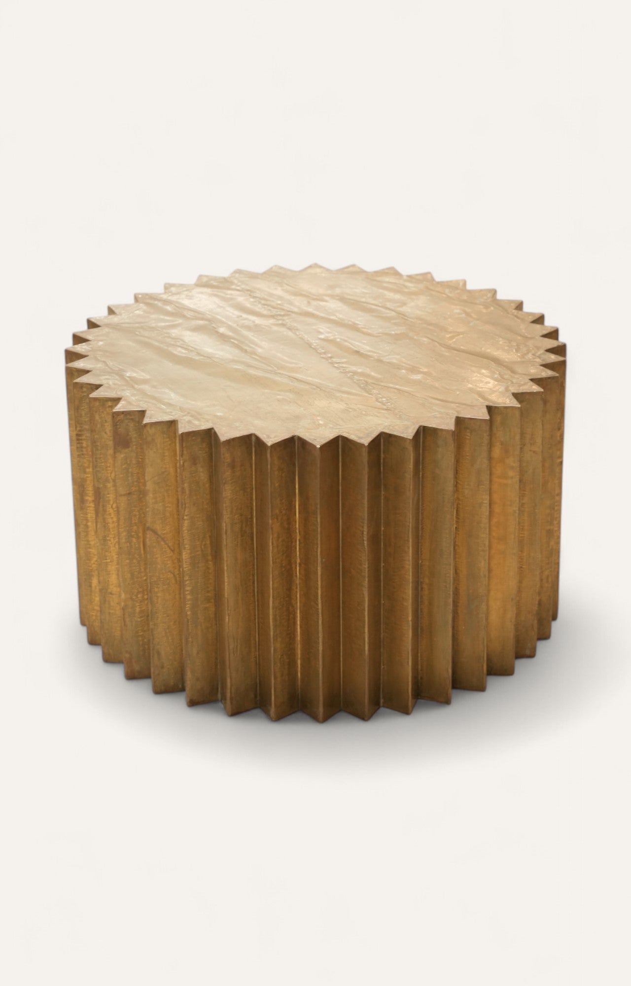 A striking centerpiece, this coffee table pairs solid mango wood with a textured brass sheet top. Its cylindrical shape, defined by vertical ridges, flaunts a modern sculptural style, while the warm golden finishes add sophistication to your living room decor. It can be used both as a functional table and a statement décor.