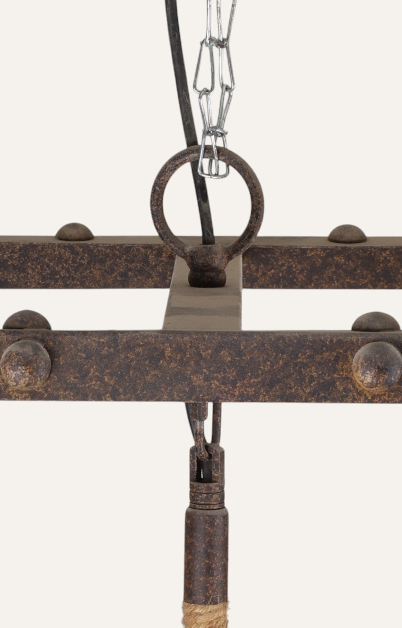 This Cage Jaune Chandelier is an eye-catching statement piece for any space. The hand-crafted metal frame features a warm, antique brass finish with exposed rivets, creating a vintage-inspired look. The three linen lampshades add a touch of elegance, while the jute detailing adds a natural element. Perfect for brightening dining tables, living rooms, or entryways, this chandelier brings a warm and inviting glow to your home.