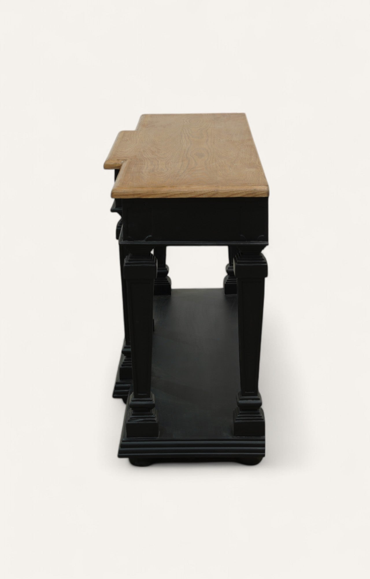 Combining colonial sophistication with practicality, this acacia wood console table carries a natural-finish top and a sturdy black base with columnar legs. Having three drawers and elegant brass hardware, it is ideal for hallways, foyers, or living rooms with bold refinement.