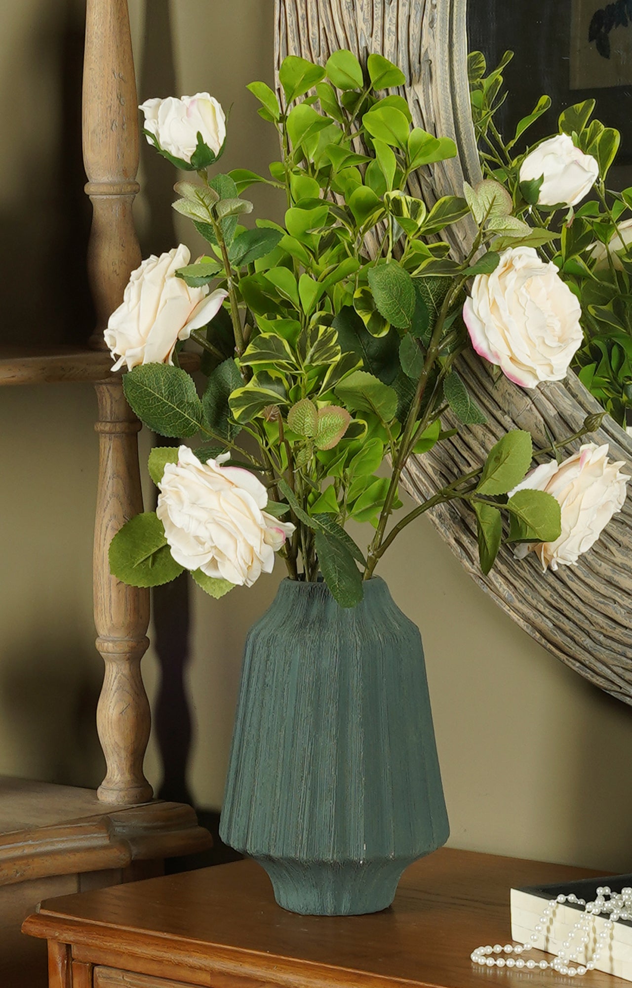 This striking vase showcases a bold cobalt blue finish, accentuated with evenly spaced vertical stripes. Its sleek cylindrical form adds a contemporary touch, making it an excellent choice for both minimalist and vibrant decor styles. Perfect for displaying fresh or dried flowers, it doubles as a standalone decor piece.