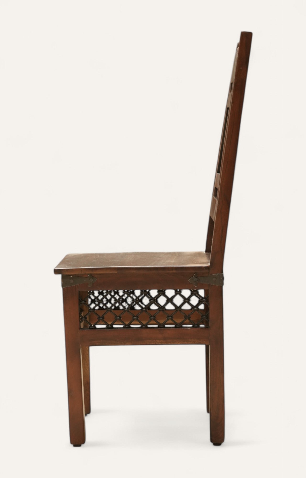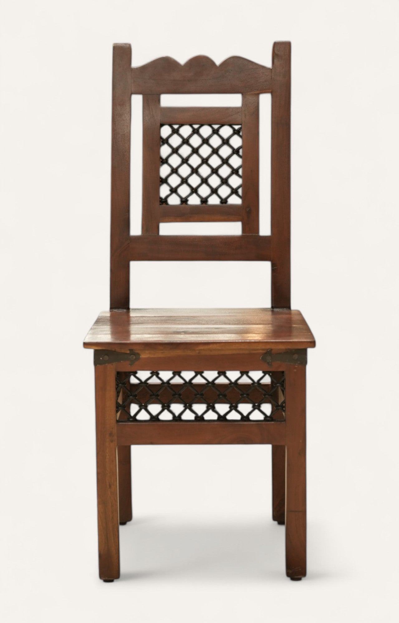 Made in solid teak wood with ornate iron lattice (jali) detail, this colonial-style dining chair combines both strength with sophistication. The natural grain is accentuated by the warm brown finish, and a touch of rustic charm is added through side iron accents. Supplied with a soft cushion seat, it serves a lasting comfort, ideal for classic dining areas with heritage flair.