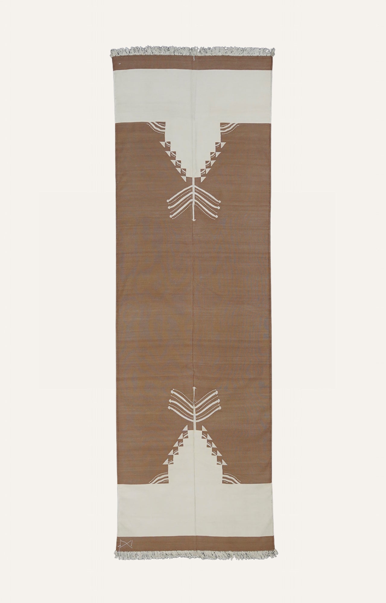 This handwoven Cotton rug combines earthy hues with a striking arrow-like pattern. The balanced contrast between soft neutrals and bold geometric shapes makes it a versatile piece for any space. Lightweight yet durable, it's designed to complement both modern and traditional interiors.
