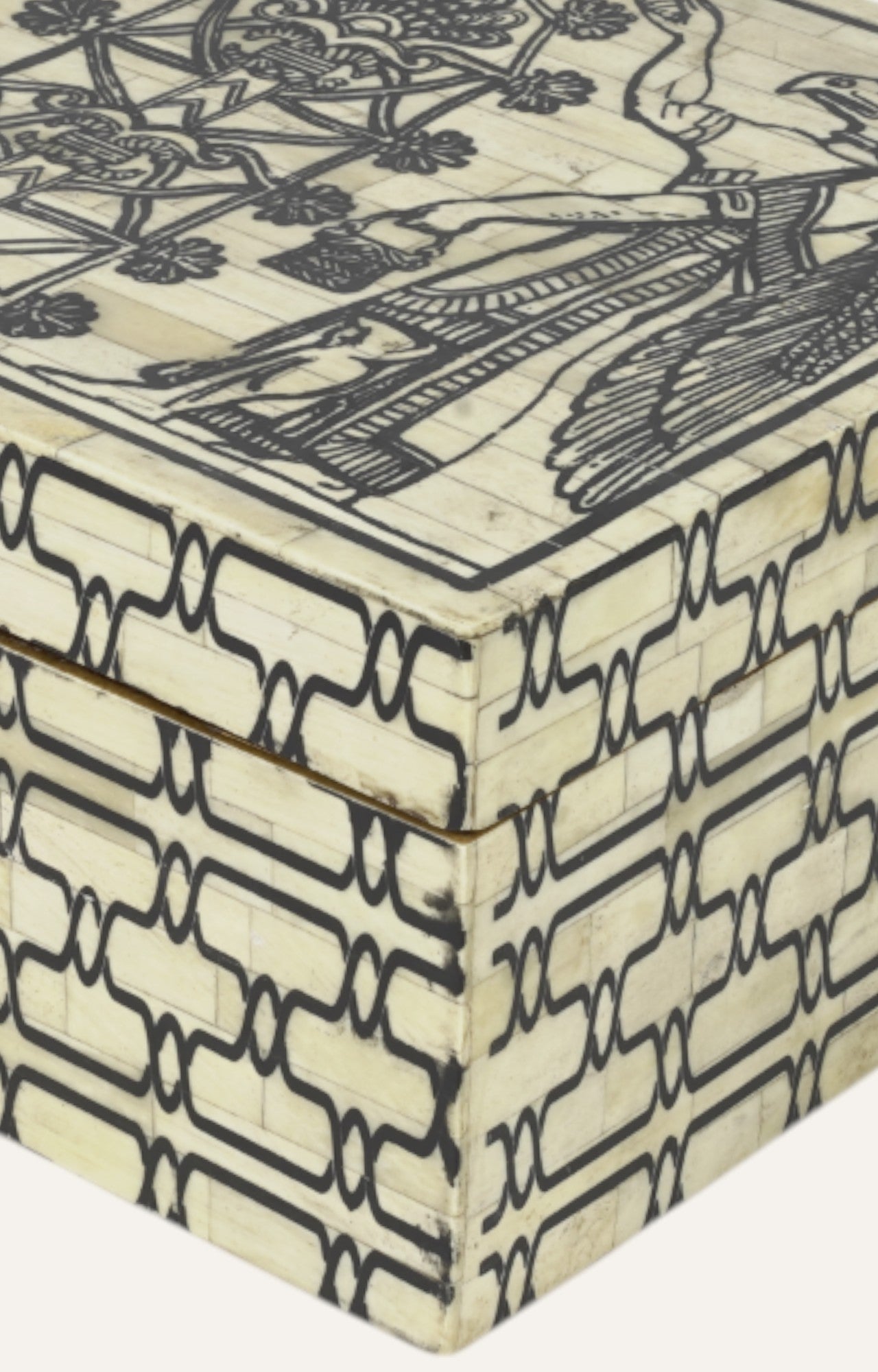 Size - 15"L x 11"W x 6"HMaterial - Mango Wood, Camel Bone, Velvet interior