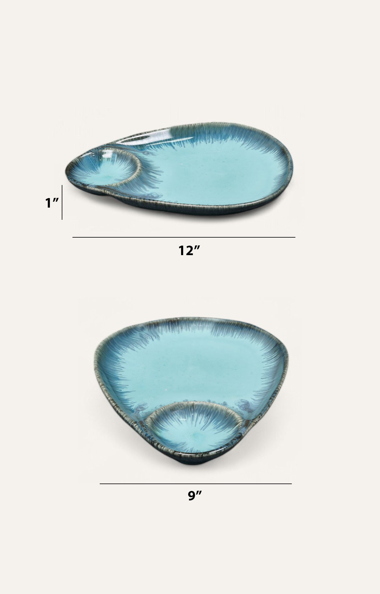 Moulded in a fish shape, this ceramic chip-and-dip platter carries a dramatic aqua glaze in dual tone along with a painterly splash around the rim. The dip bowl features a recessed space flowing seamlessly into the form for an elegant yet very functional presentation. The handmade finish of this studio pottery adds a clean, artisanal vibe to your get-togethers, while the food-safe coating makes it ideal for presenting snacks, mezze, or munchies.