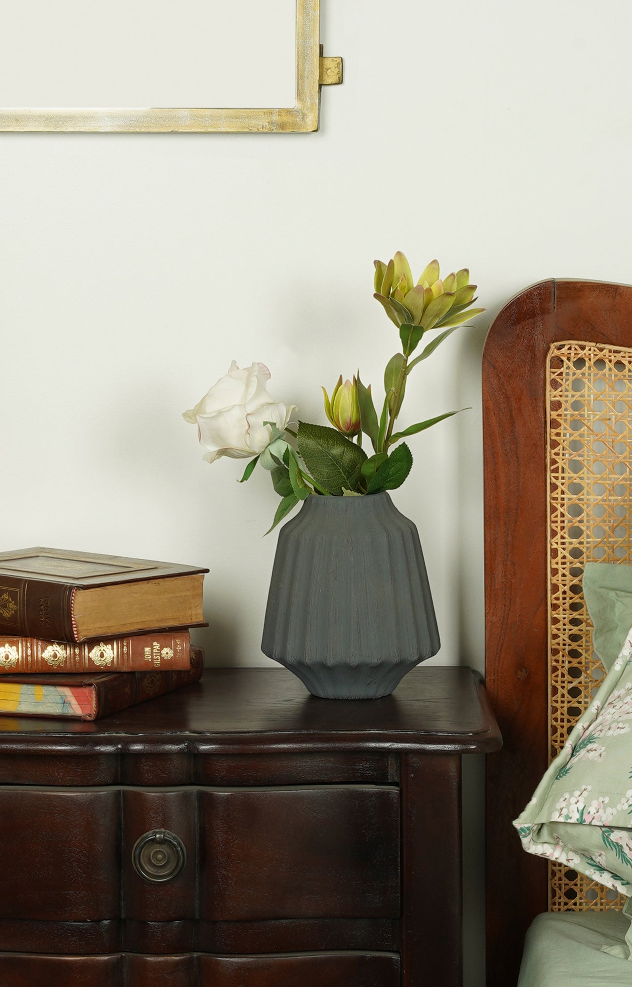 This elegant vase features a distinct fluted design, showcasing a modern and minimalist aesthetic. The textured grooves of the grey ceramic finish create a beautiful contrast, enhancing its simple yet striking form. Perfect for adding an understated touch to any space, this vase pairs effortlessly with both fresh and artificial arrangements.