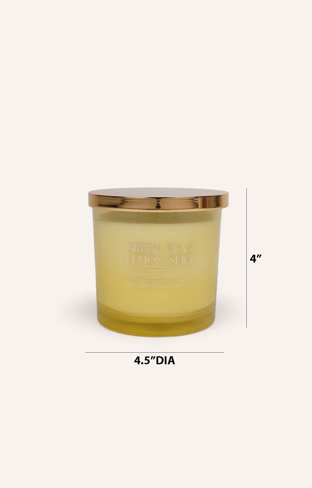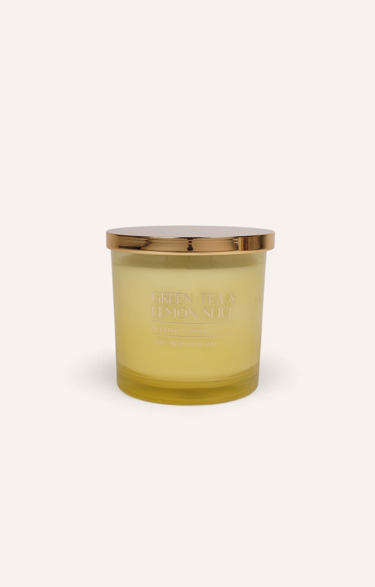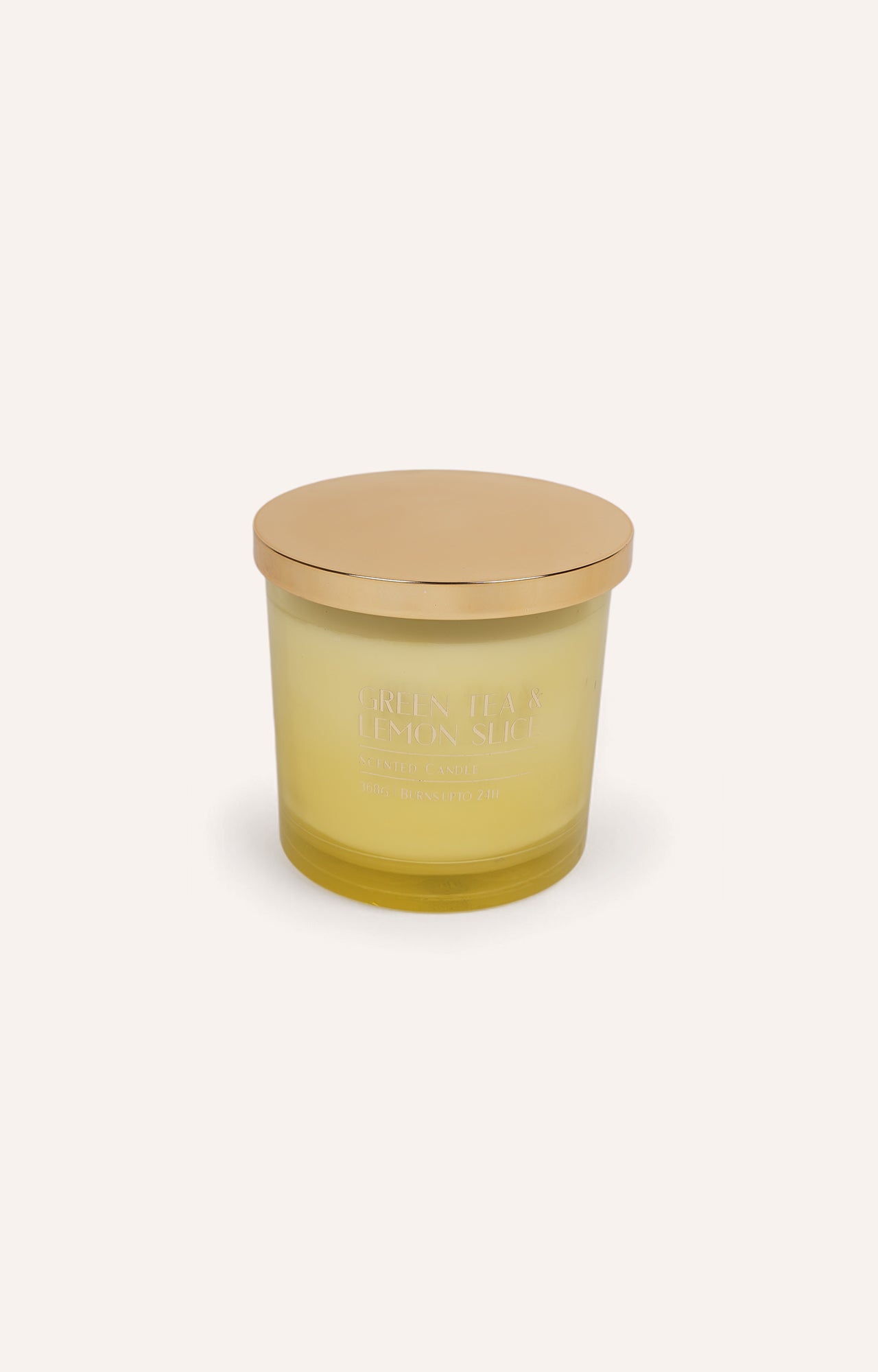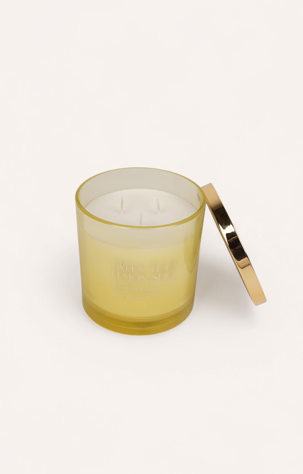 > The candle features a green tea and lemon slice scent, offering a crisp and revitalizing fragrance.