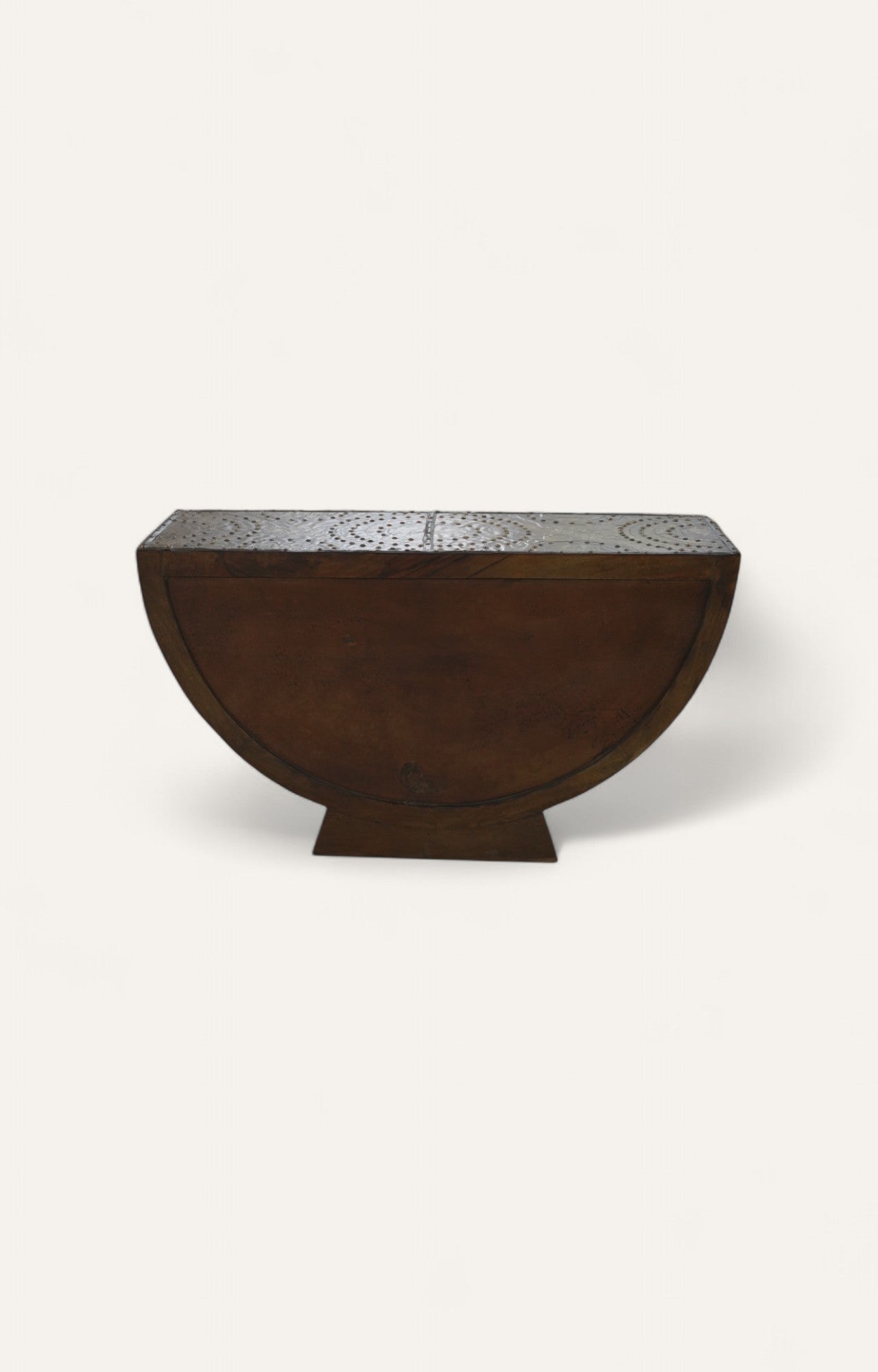 With its astonishing half-moon shape and meticulously set brass studs, this vintage mango wood chest of drawers is a true representation of beauty with functionality. While the rich brown finish perfectly highlights the curve, the spacious drawers offer ample storage in a sculptural format. With the wide top, it also serves ideally as a console table.