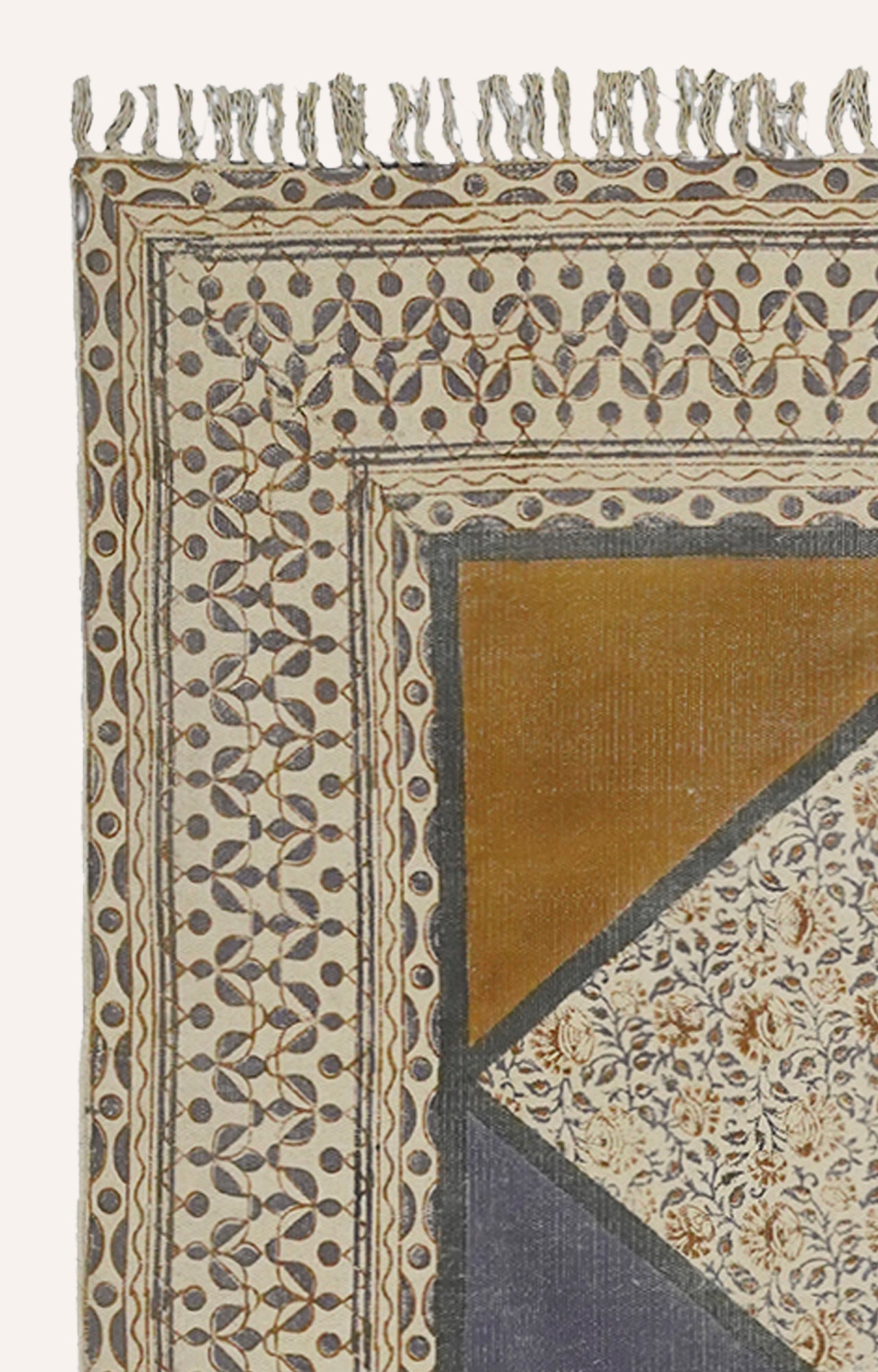 This textured area rug showcases bold geometric patterns with two central diamond shapes and floral motifs using screen print. And the center features two diamonds features solid mustard yellow and deep indigo, while the other two are patterned with white and golden yellow floral motifs. A narrow border of interlocking circles and leaf shapes adds detail. The edges are finished with short, frayed fringes, enhancing the rug’s artisanal feel. The warm combination of yellow, indigo, and earthy tones creates a welcoming atmosphere.