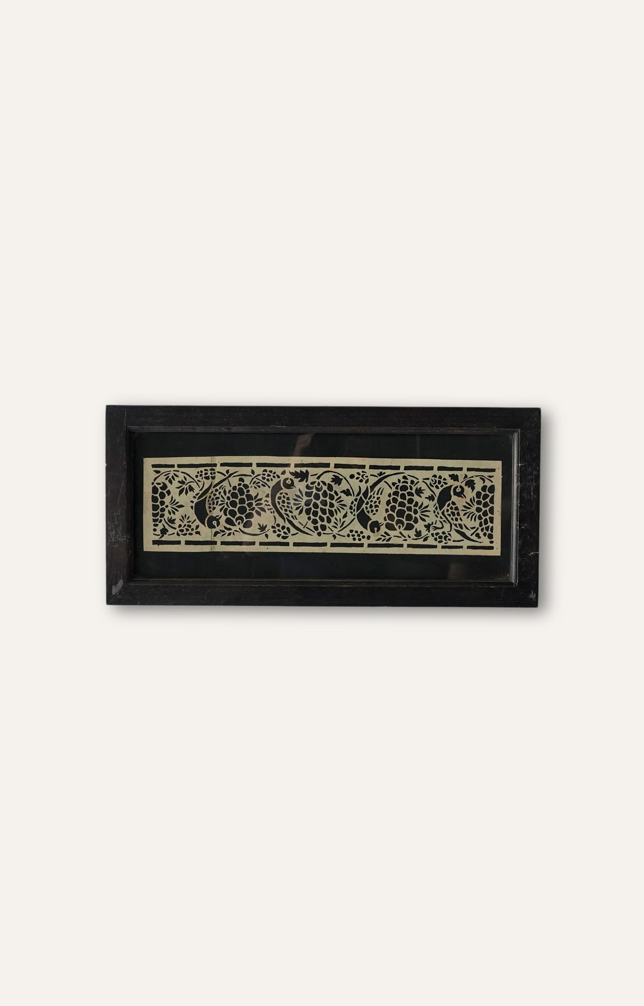 This stencil artwork features a beautifully detailed peacock pattern, showcasing the elegance of traditional motifs. The intricate design highlights the graceful form of the peacock, making it a striking addition to any interior. Encased in a wooden frame, this piece is crafted to enhance both classic and modern spaces.