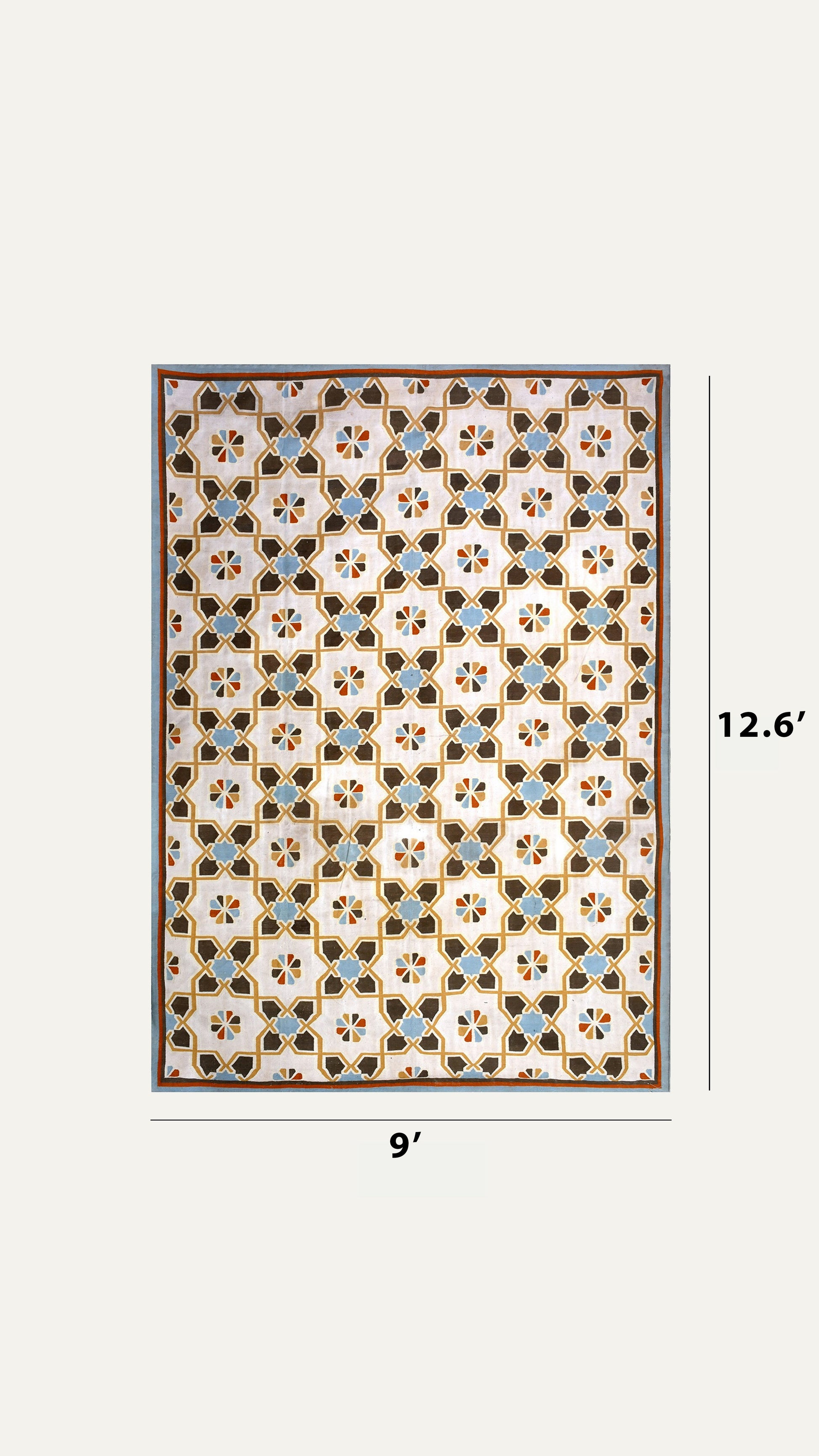 A vibrant cotton rug with a structured pattern combining geometric shapes and floral motifs. The light cream background enhances the dark brown, orange, deep yellow and blue tones, creating a dynamic, balanced design. Stylized six-petal flowers, cross and diamond motifs, and contrasting squares form an intricate, symmetrical composition. The fabric is bordered by dark brown and reddish-orange band, adding a visual frame and highlighting the intricate design.