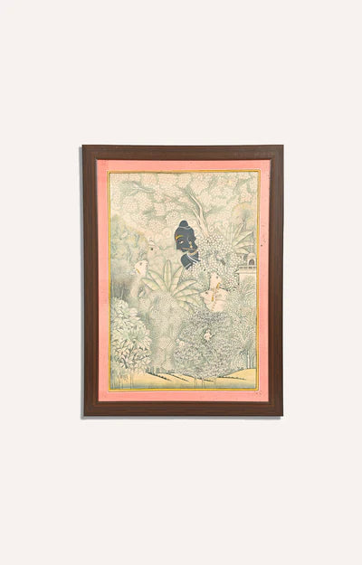 Hidden amidst lush greenery, Krishna, with his flute in hand, gently gazes over the peaceful landscape. The soft, earthy tones of the painting, coupled with delicate details of the surrounding foliage and animals, create a harmonious balance, highlighting Krishna's deep connection with nature and his divine role as protector of all living beings.