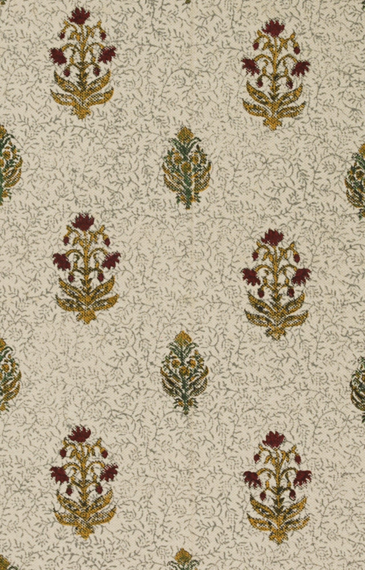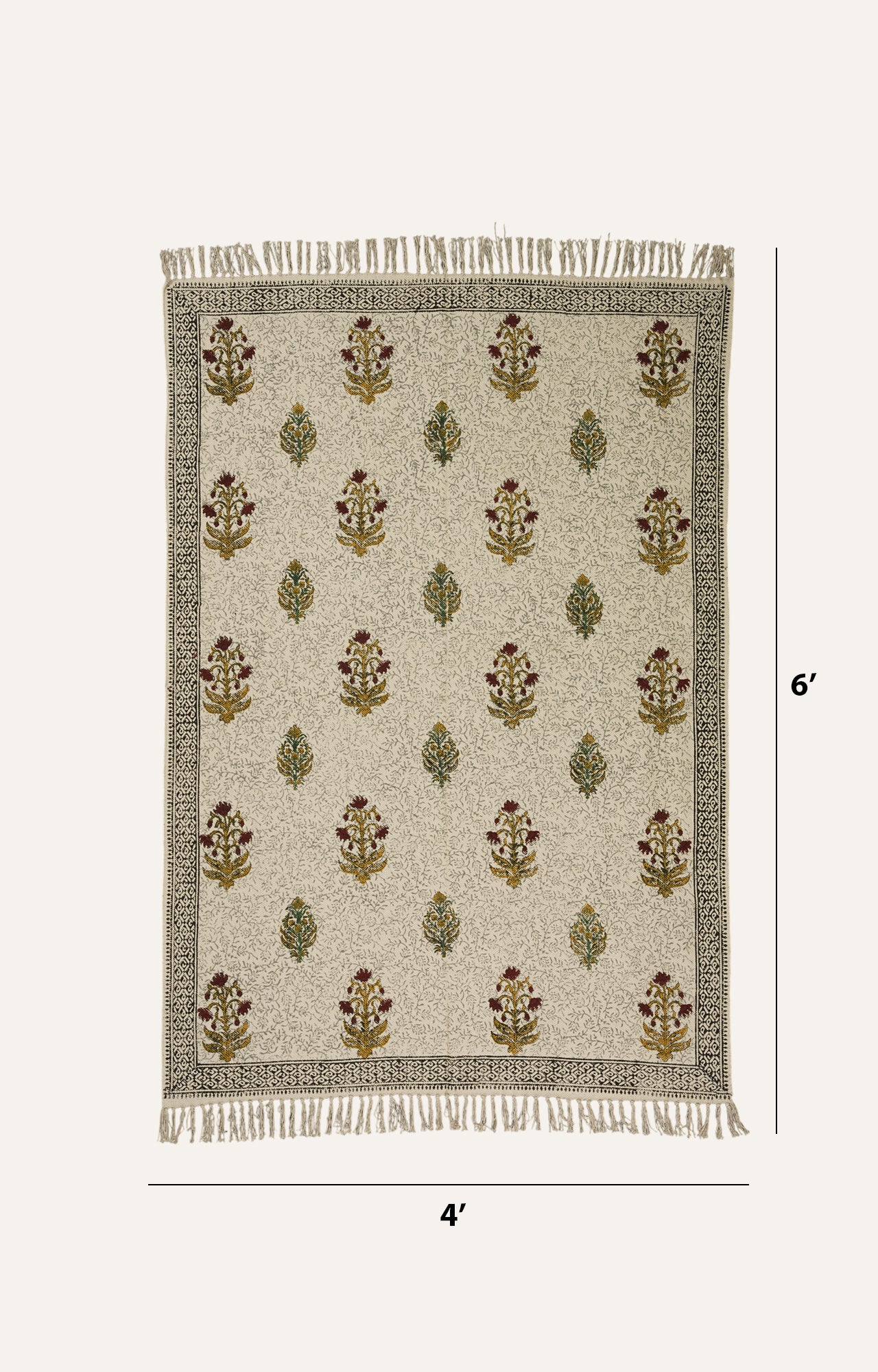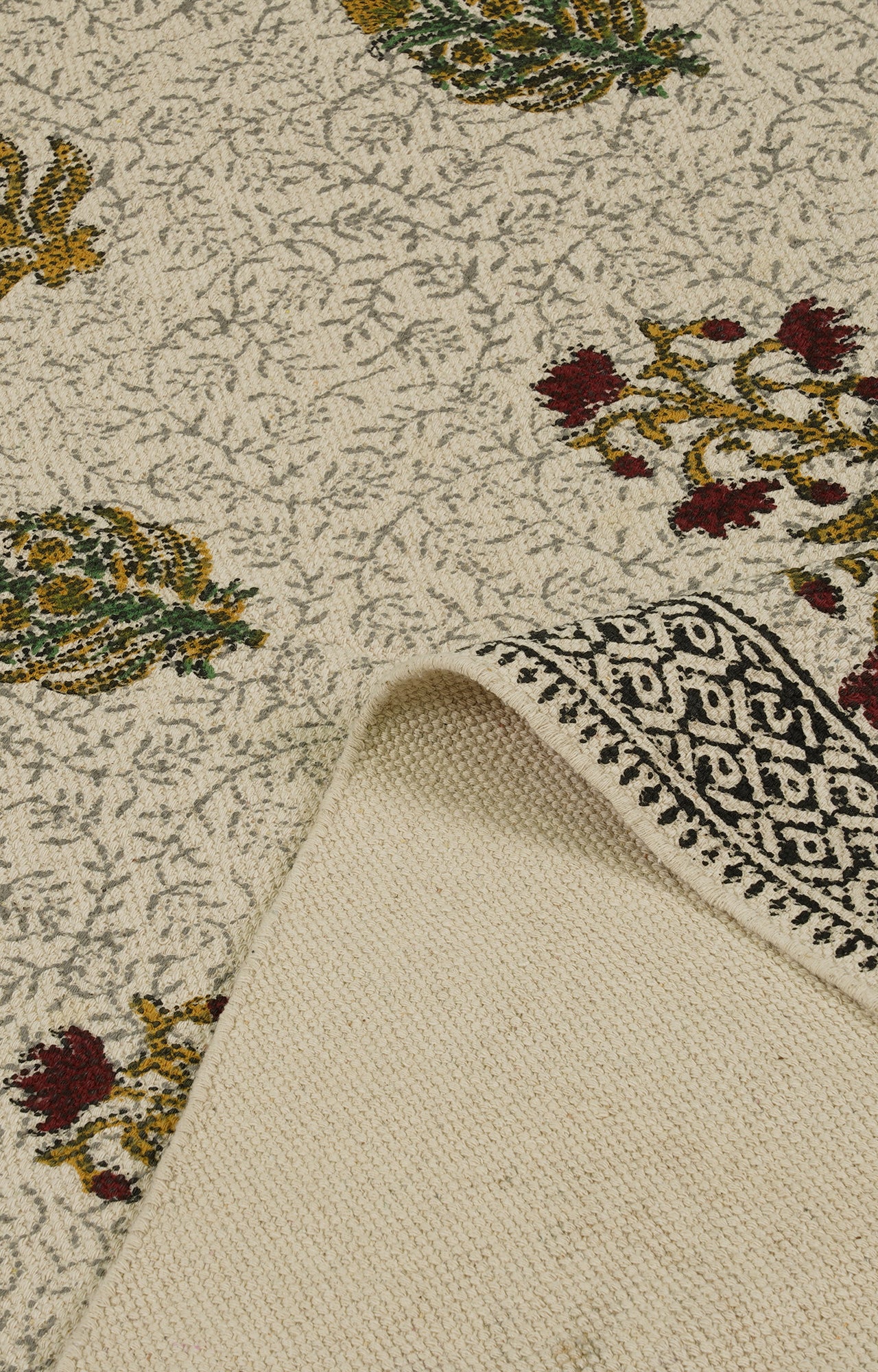 This refined cotton rug boasts a Mughal-style floral buta pattern playfully arranged across the surface of an ivory backdrop with discreet vine-like accents. While the handmade refinement adds to the texture, mustard, maroon, and dark green provide classic charm to traditional, as well as transitional, spaces.