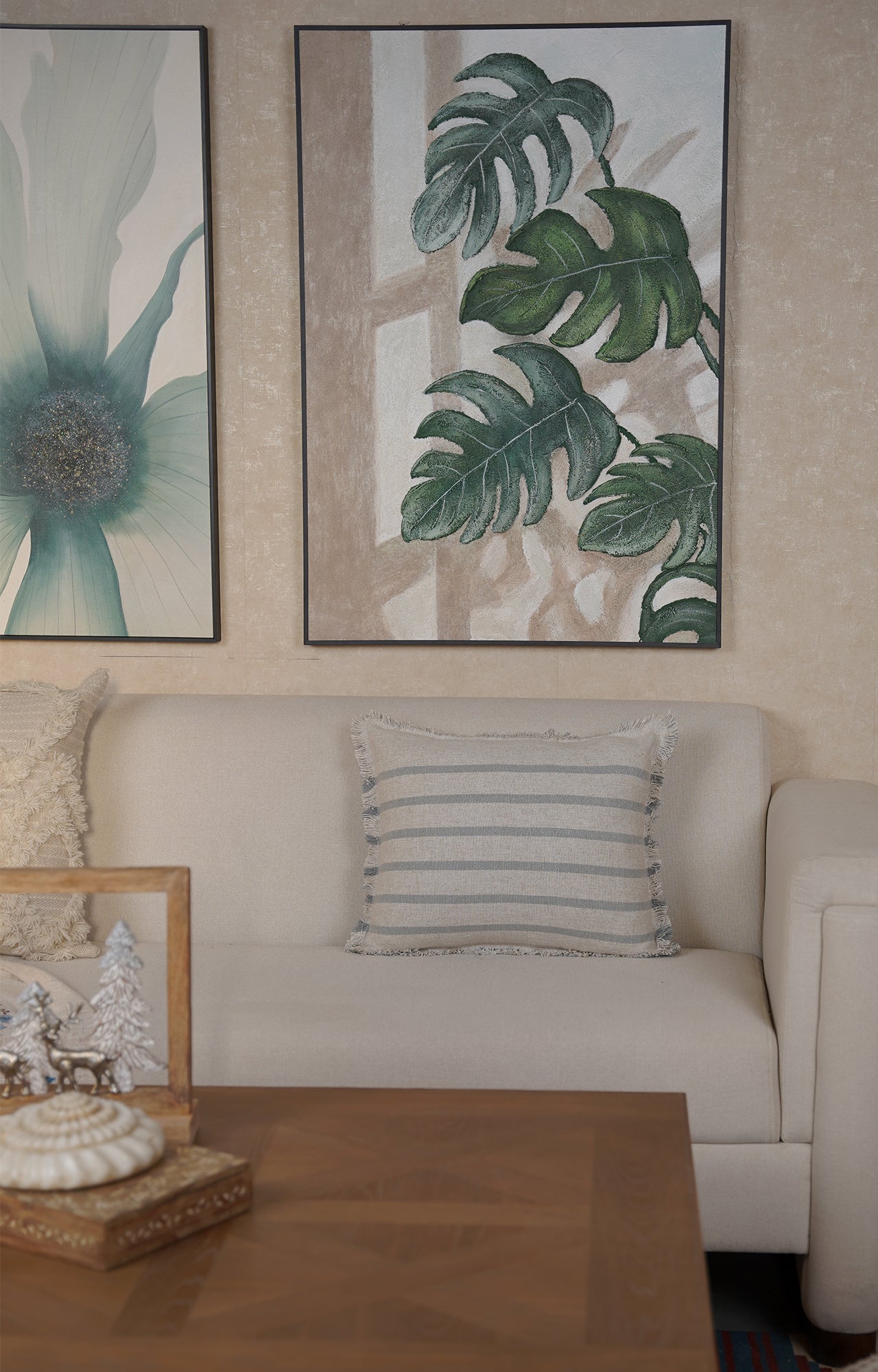 Holding a soft striation of indigo streaks over a soothing linen background, this cushion cover can effortlessly evoke novelty in any summer afternoon. Owing to the handwoven texture, it is perfect for airy balconies or a beachy space decor with a laid-back vibe. Subtle yet striking to the eye, it carries bold yet beautiful blue layers over an off-white base.