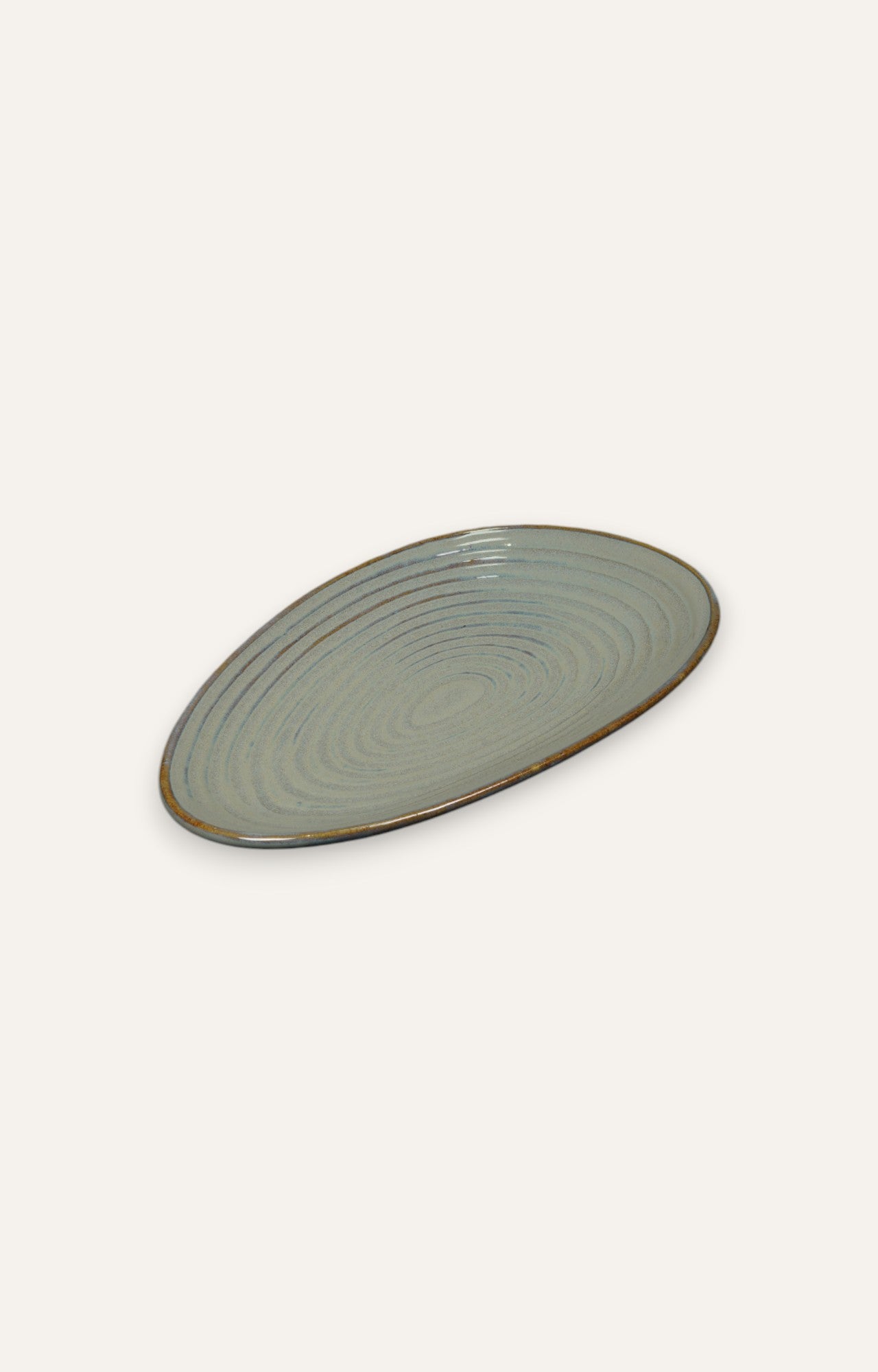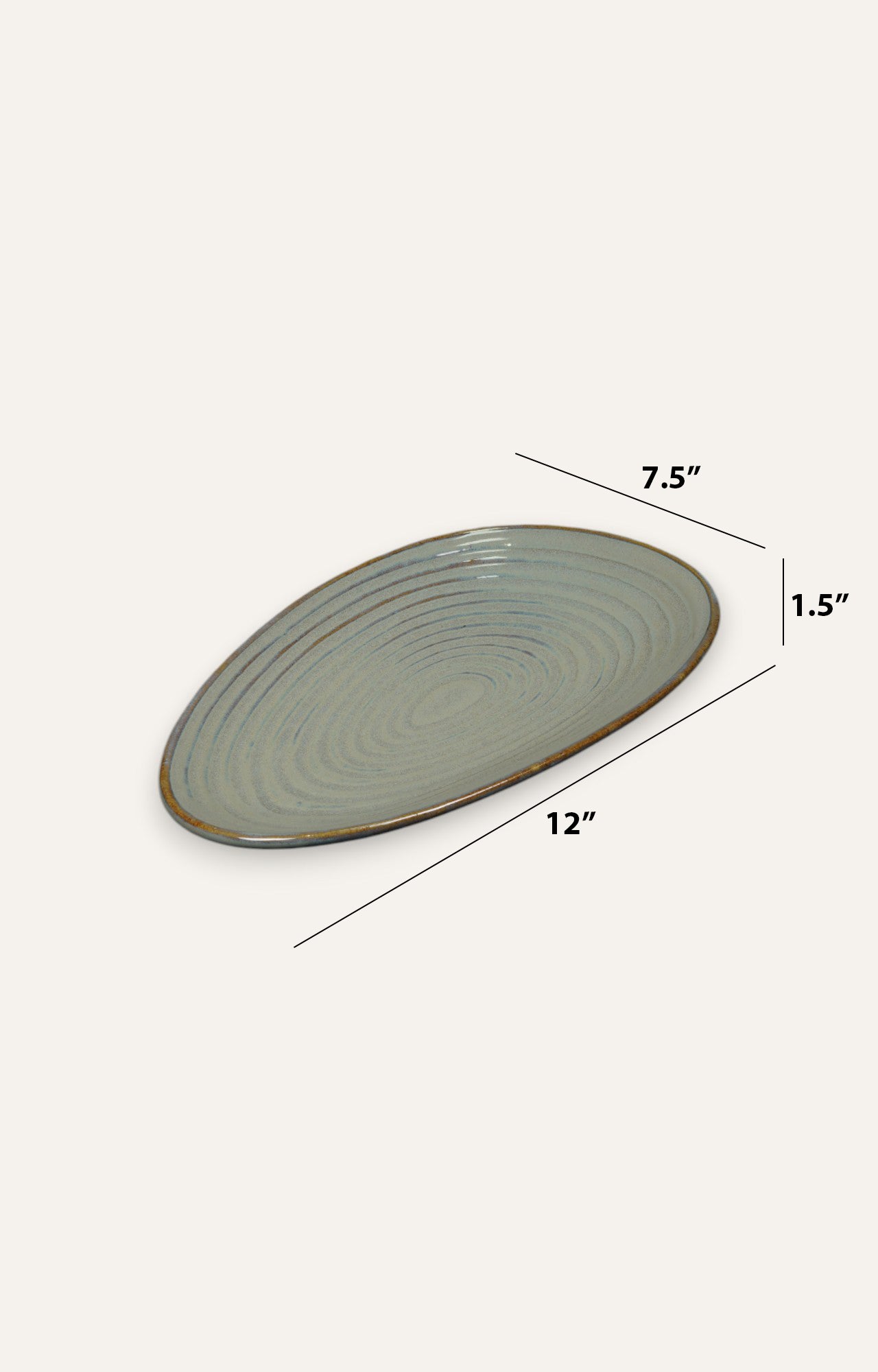 Being a dining table statement piece, this spacious ceramic platter is a replica of the organic egg shape. The muted swirl glaze creates high visual interest. Owing to the increased surface area, it is appropriate for holiday spreads or centerpiece presentation.