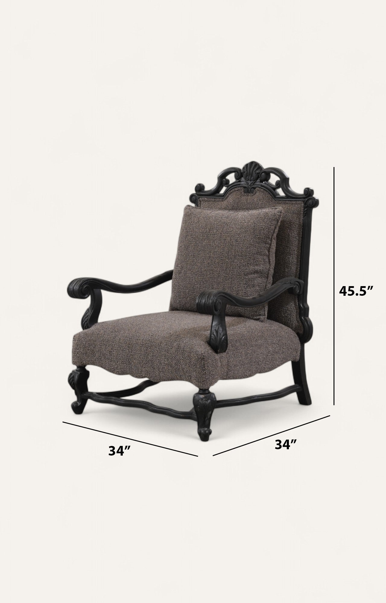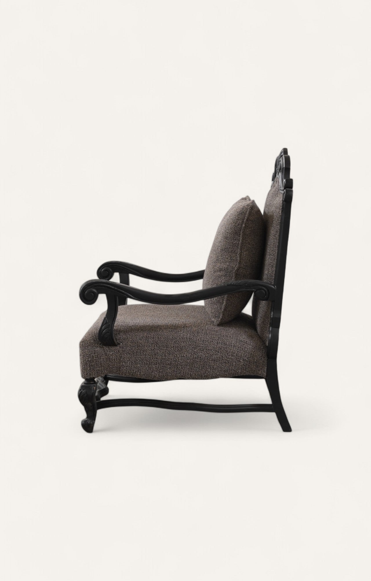 This black acacia lounge chair is an ode to structure and relaxation. The high back, scrolled arms, and beautiful carved silhouette give it an impeccable royal look. Since the textured linen upholstery and soft cushions serve unparalleled relaxation without a split, this wooden armchair is ideal for libraries, bedrooms, or sitting rooms.