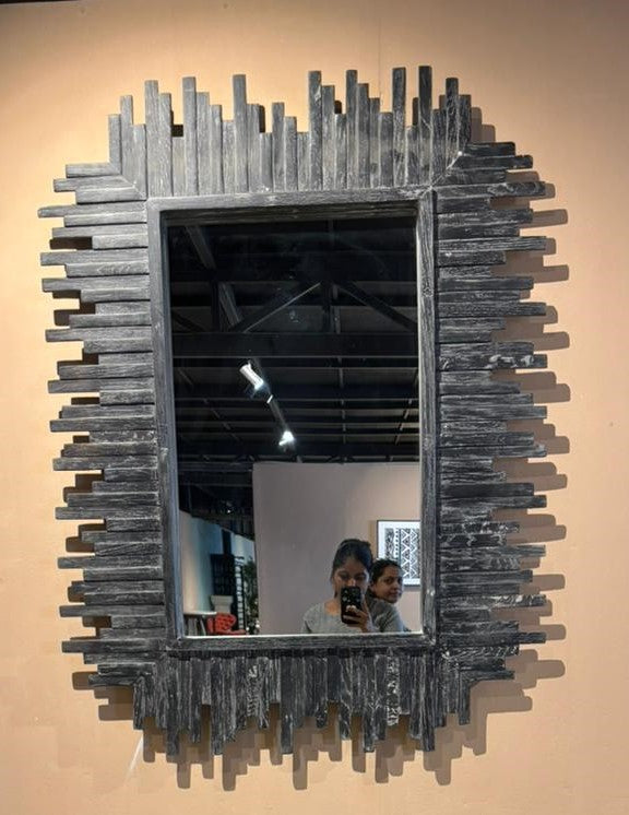 A striking rectangular mirror framed by a textured sunburst design in deep charcoal tones. Crafted from wood with a distressed finish, the frame layers staggered, uneven beams to create sculptural depth and a play of light and shadow. Both modern and dramatic, it brings a sense of bold architecture to your walls.