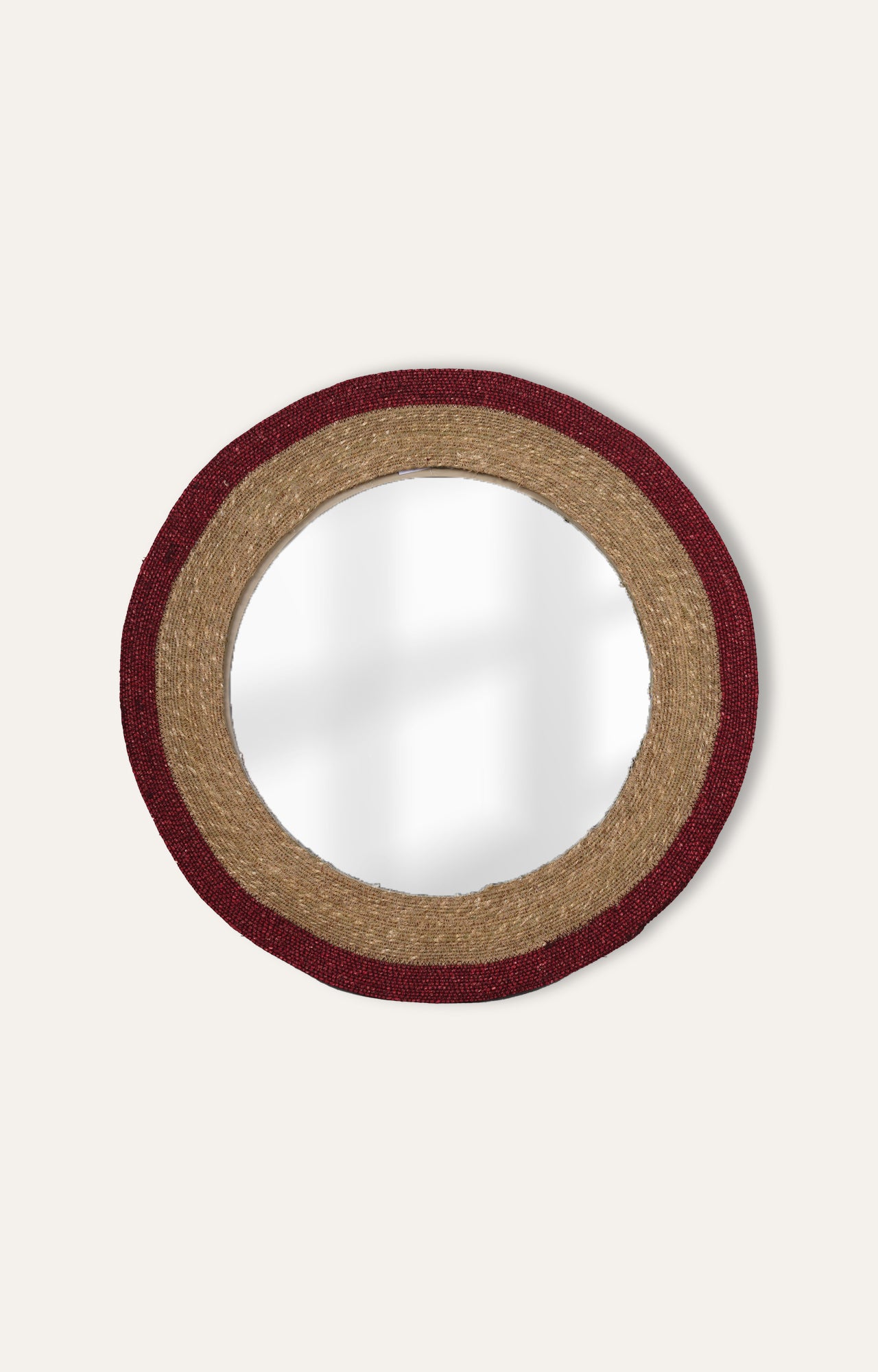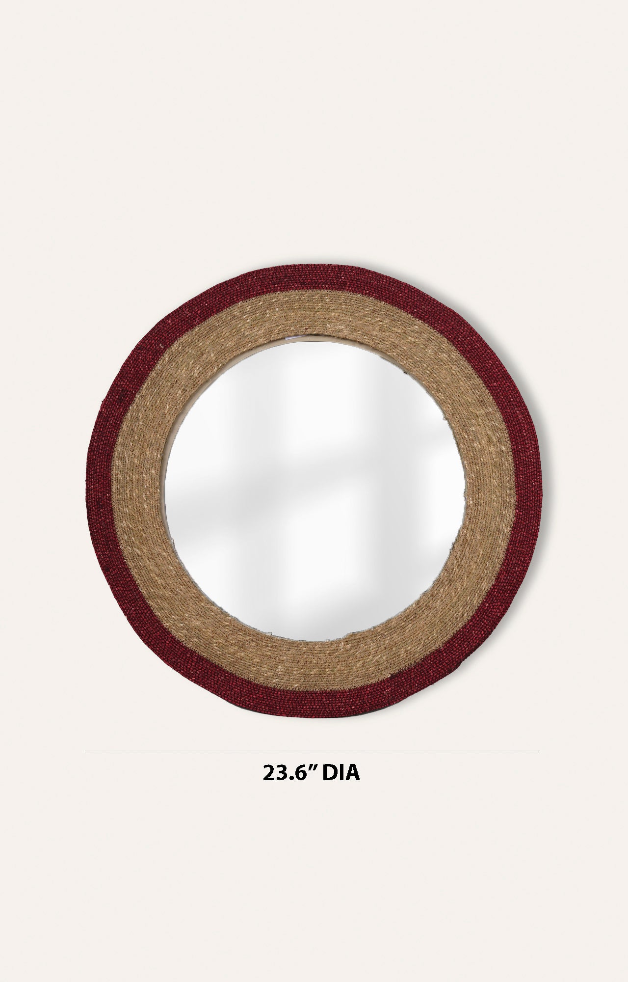 This round mirror is framed with a dual-layer seagrass design. The outer layer is made from seagrass painted in a rich red hue, adding a bold and elegant touch. Beneath it is the natural, unpainted seagrass, which features a textured, woven pattern that enhances the rustic charm of the mirror. The contrast between the red-painted seagrass and the natural beige creates a striking, visually appealing design, balancing modern sophistication with natural elements.