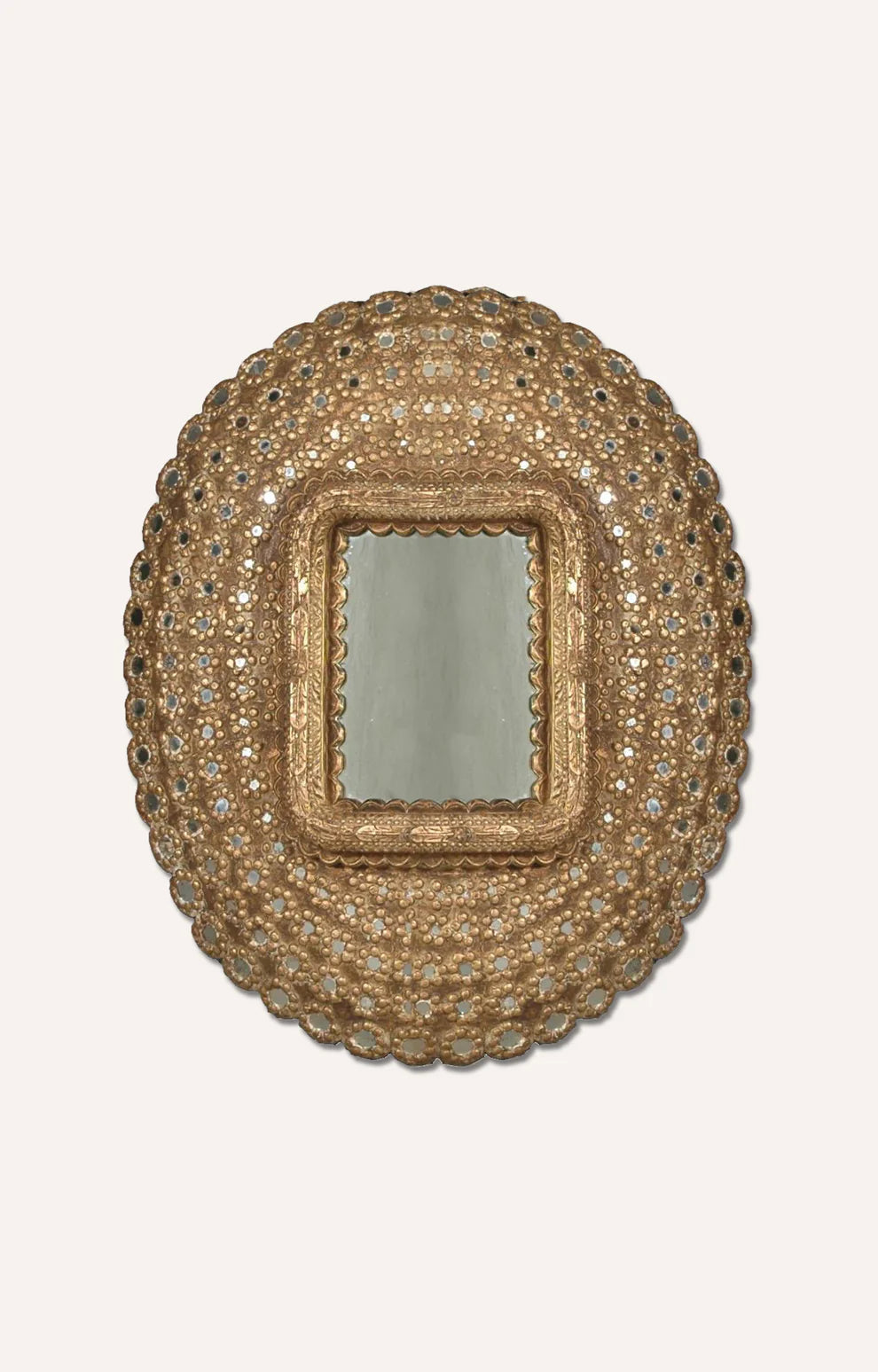 Our Ornate Oval Studded Mirror makes a striking focal point with its bold layered frame and studded detailing. Handcrafted with care, the design features concentric rings that draw the eye inward toward the rectangular mirrored glass. Rich in texture and presence, it brings a sense of drama and character to entryways, dining rooms, or feature walls, making it as much an artwork as a functional mirror.