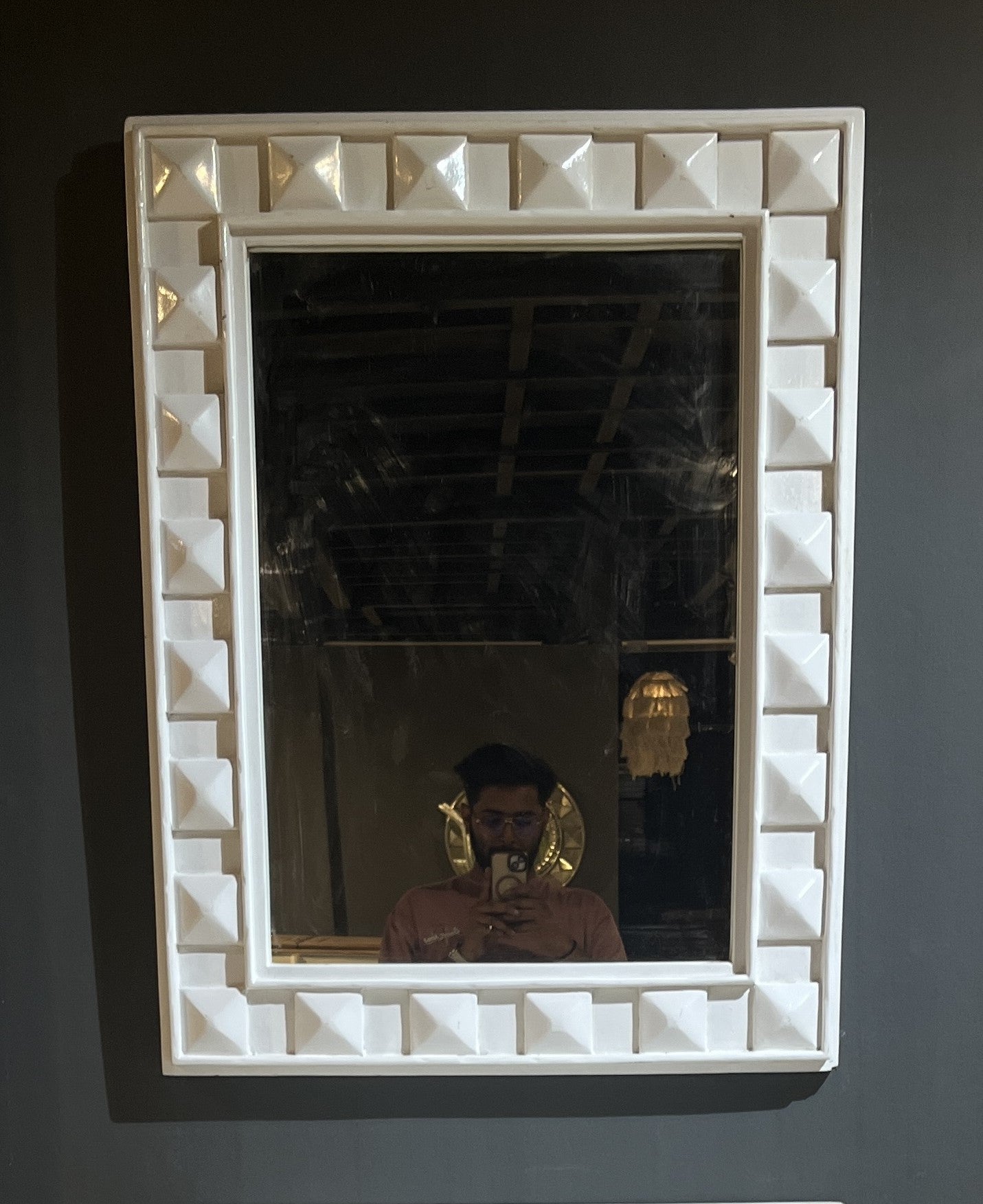 Framed in a bold geometric design, the Regal Silver Mirror brings a sense of grandeur to any interior. Handcrafted from wood and finished in a silver look, the frame combines pyramid-like facets, creating a play of light and texture. Perfect for entryways, dining rooms, or above a console, it works as both a functional mirror and a decorative statement.