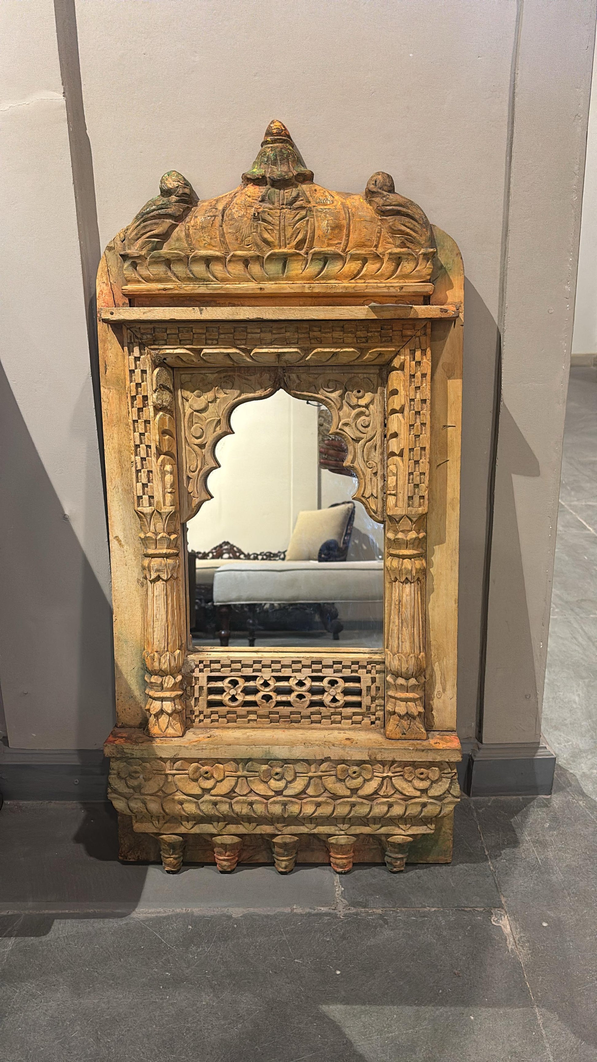 Our Heritage Jali Mirror draws inspiration from the carved stone latticework (jali) found in India’s historic forts and palaces. Handcrafted in wood, the frame is richly adorned with lotus and floral motifs, that echo Mughal and Rajasthani architecture. The mirror captures the grandeur of old-world craftsmanship while serving as a striking focal point in contemporary homes. Ideal for entryways, living rooms, or gallery walls, it celebrates India’s enduring design traditions.