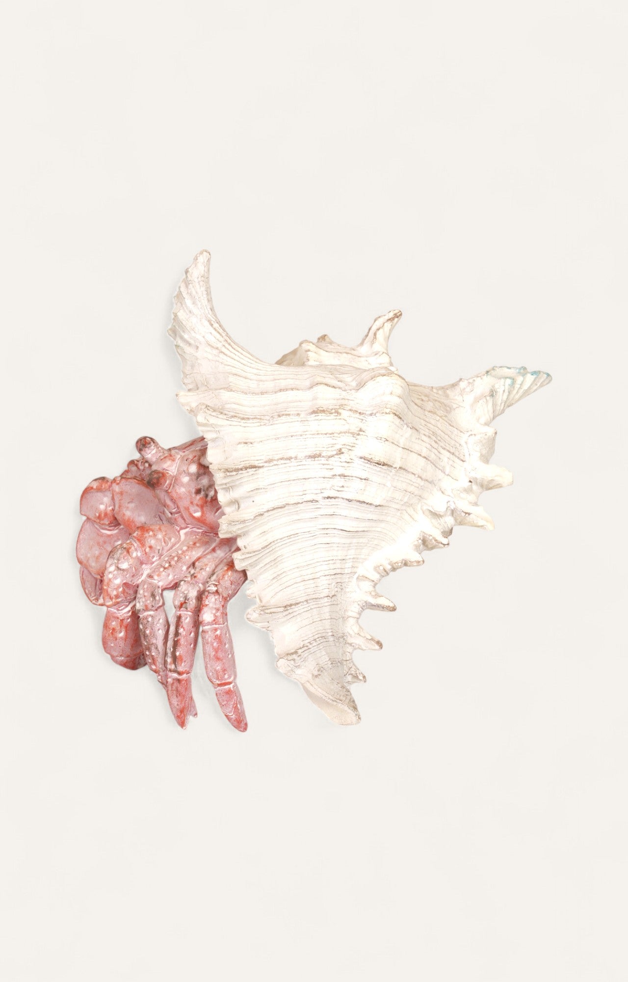 this Decorate Hermit Crab Sculpture. Expertly cared from resin, it features a realisc conch shell and detailed crab design finished in soju coral and white tones. Perfect for coastal, faucal, or beach- inspired interiors, this piece adds texture, color, and marine charm to consoles, shelves, or tabletop displays.
