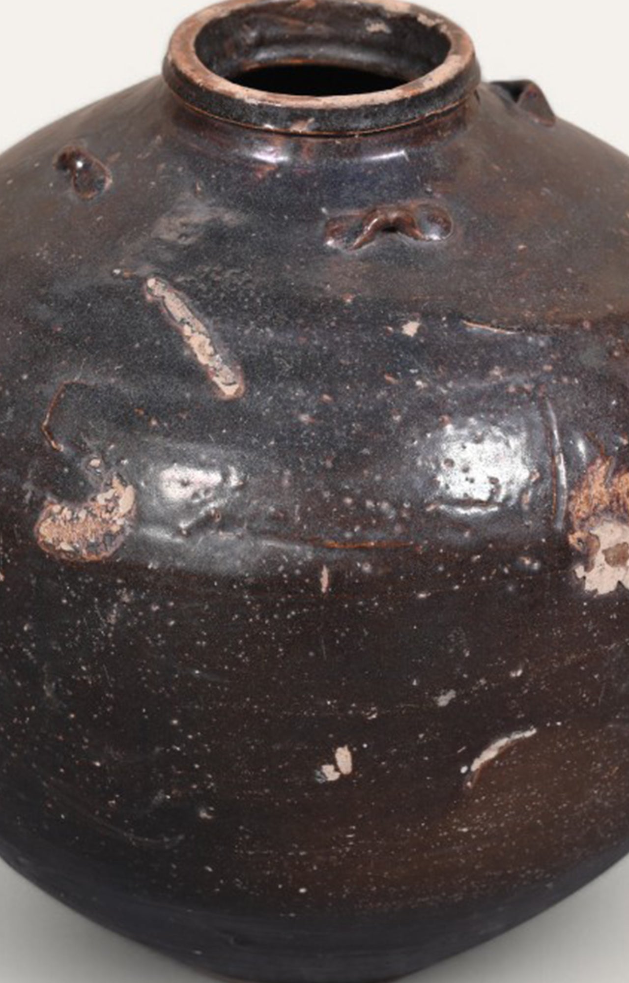 Designed in the style of traditional Chinese pottery with abstract handle design. Its crafted by a small group of artisans from Malaysia, who have honed their craft over many generations. Black glazed distress antique-effect finish adds its charm.