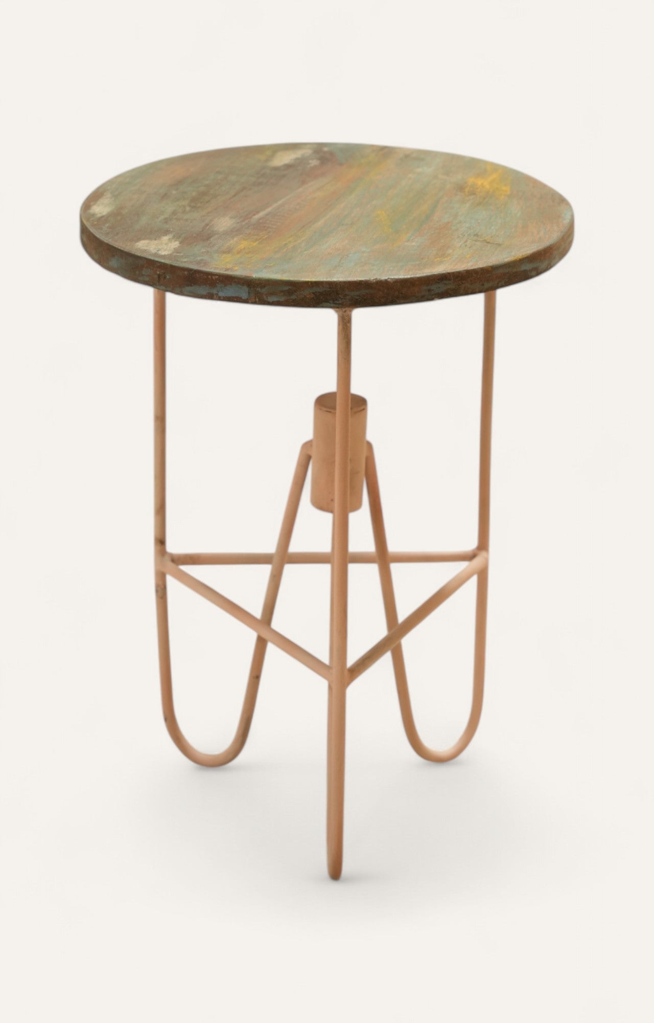 Distressed wood top with muted painted iron legs.