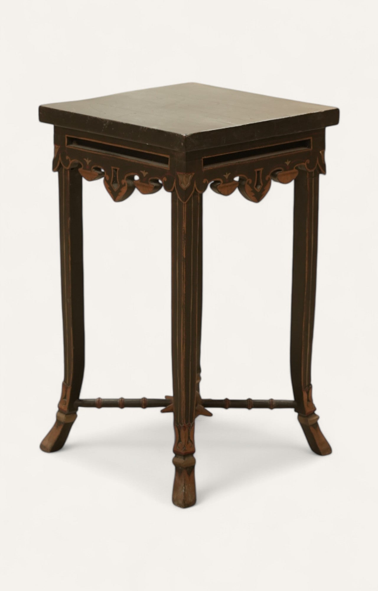 Moroccan-inspired design with carved apron and versatile usage as a corner or accent table.