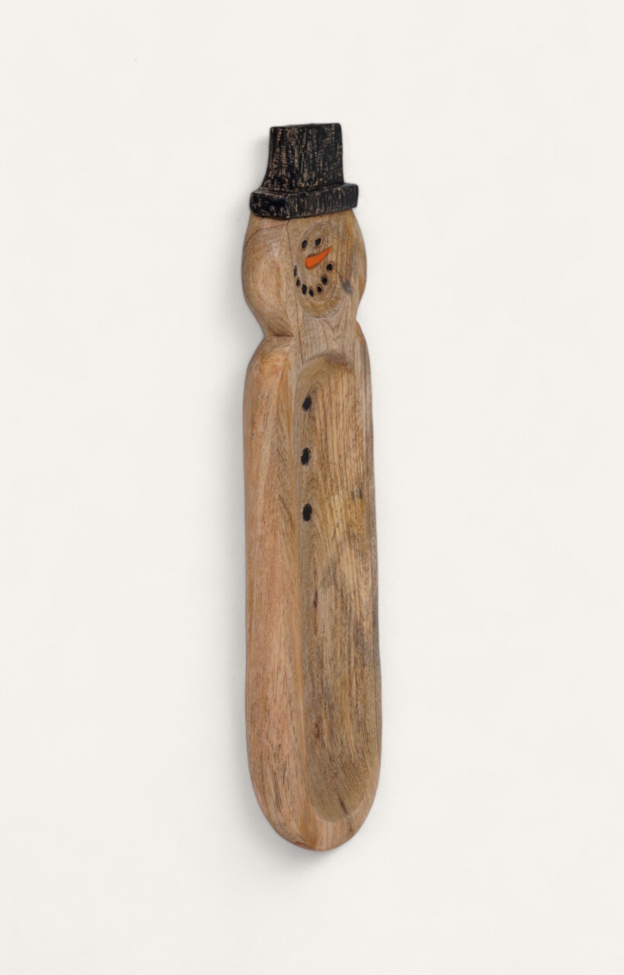 > Hand-carved wooden serving tray in the shape of a snowman.