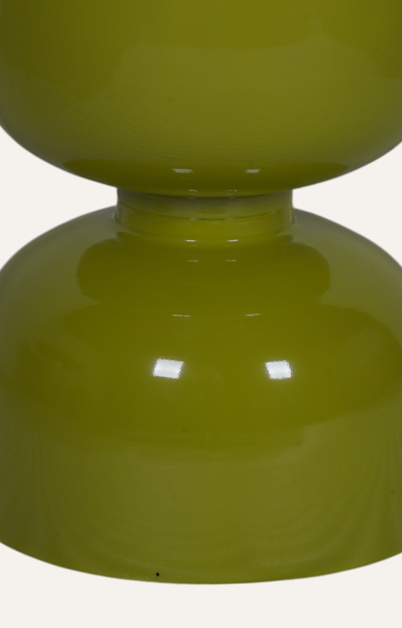 Embrace the refined mid-century mood with modern ease and elegance. Here is a subtle statement of style and service in the form of a contemporary hourglass stool. Painted in a soft olive green hue using lacquer finish, this multi-functional side table holds sturdy fiber in its base. This soothing beauty fits itself well as a cool stool, or a chic pouf, or a compact bedside table.