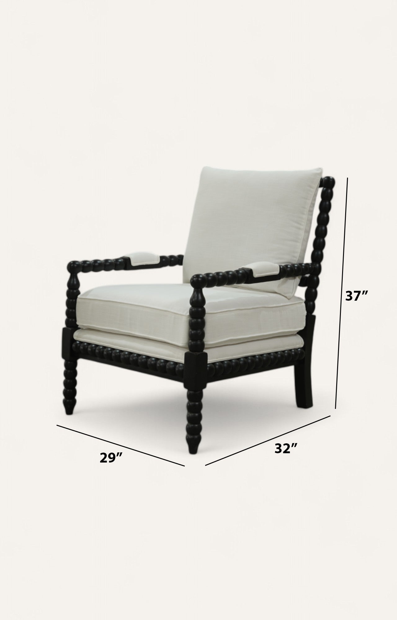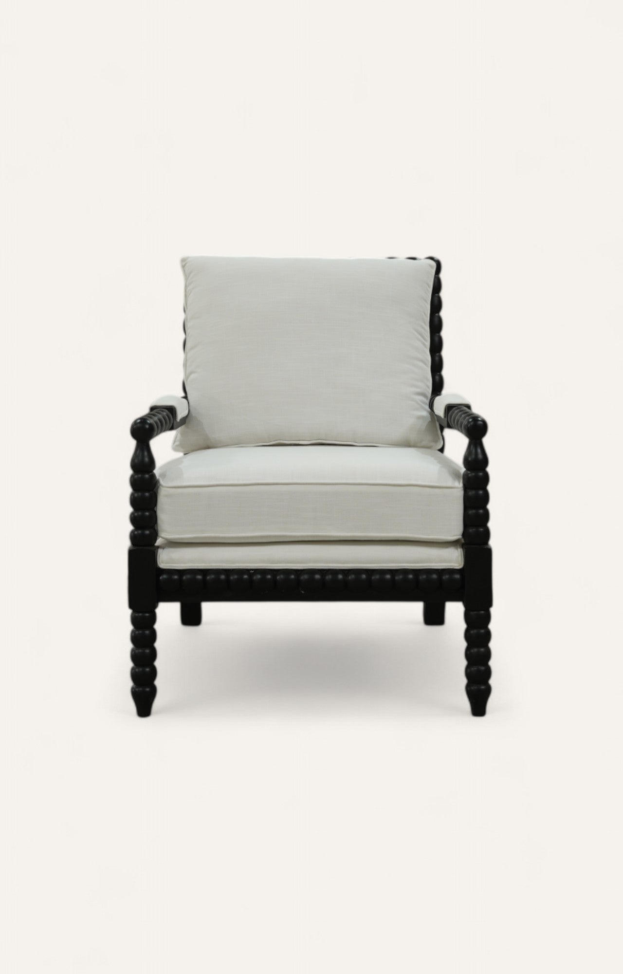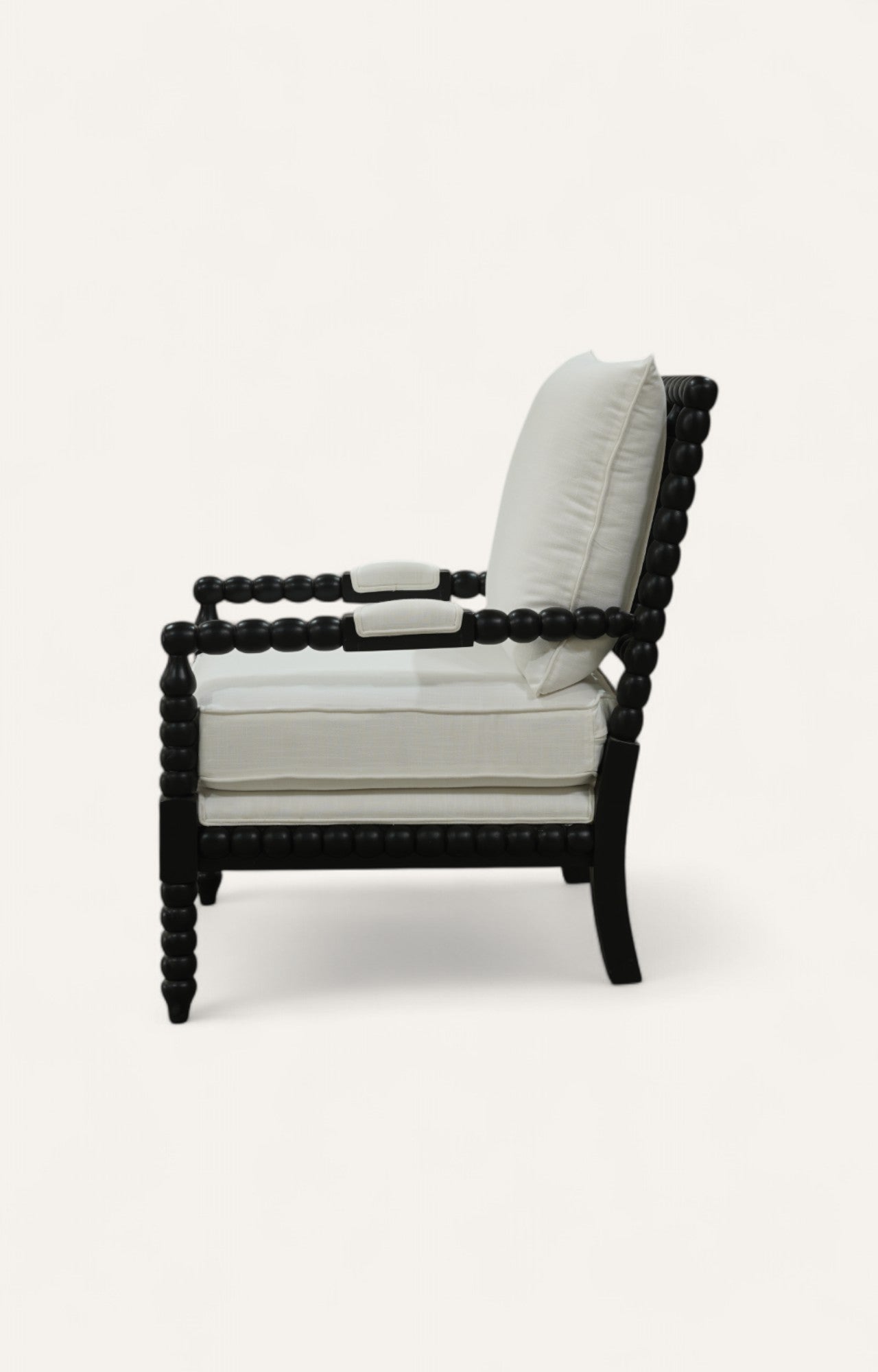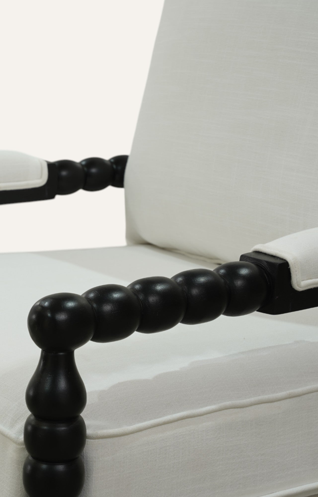 Designed for comfort, the lounge chair boasts exaggerated bobbin legs and armrests in rich black wood. Ivory-toned seat and back cushions provide a sophisticated contrast, ideal for complementing similar settees or seating alone in a reading nook.