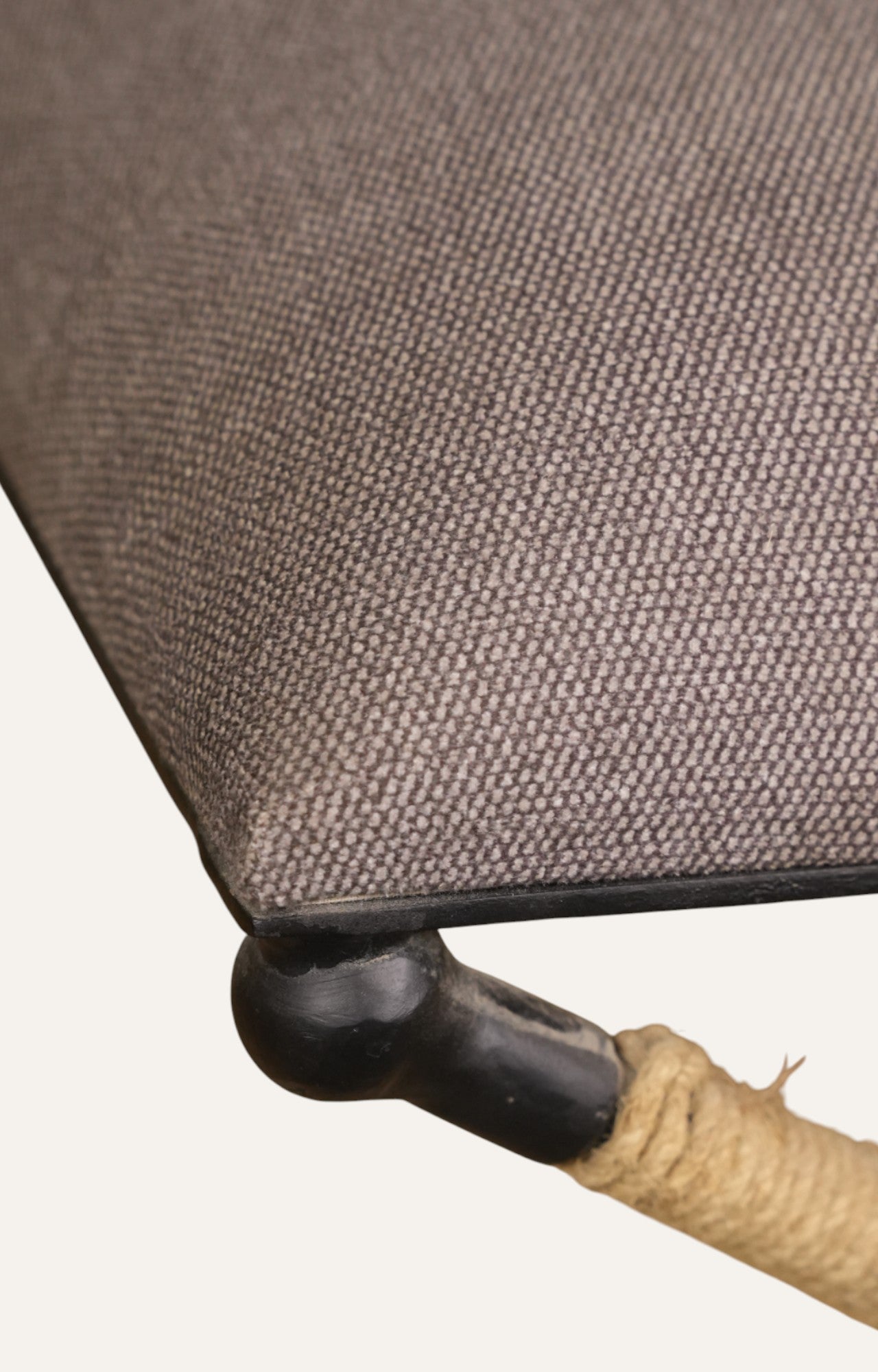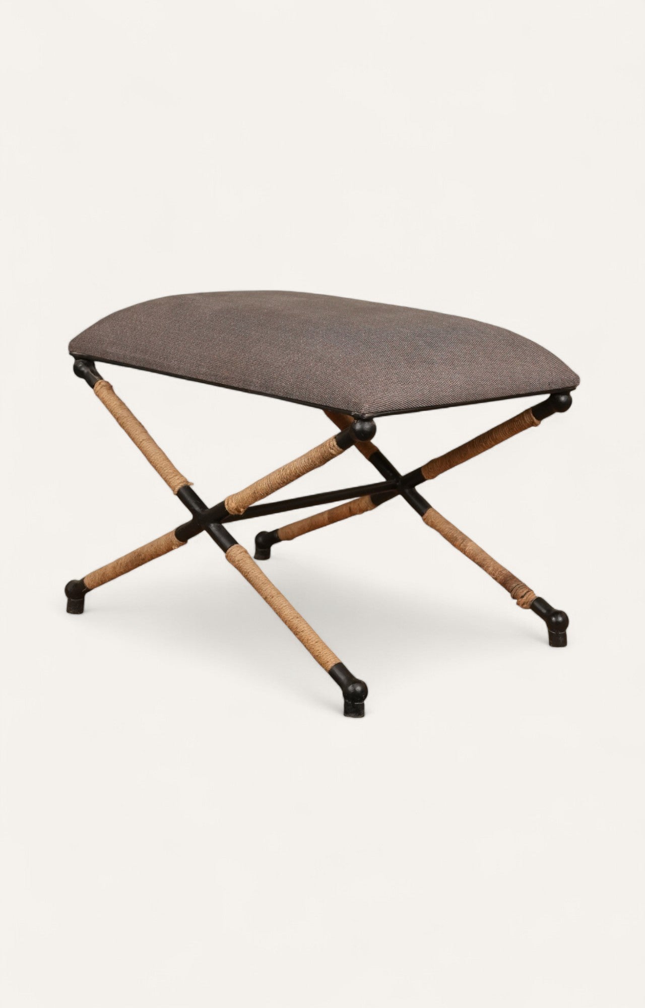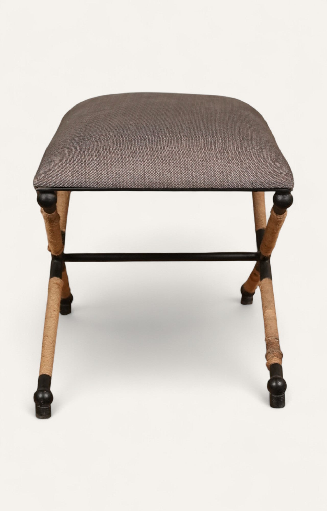 Add a touch of rustic charm and modern functionality to your home with this upholstered ottoman stool. Featuring a sleek cushioned seat in a versatile neutral fabric, it’s designed for comfort and style. The cross-legged metal base with natural rope wrap detailing gives it a handcrafted appeal while ensuring durability and stability.