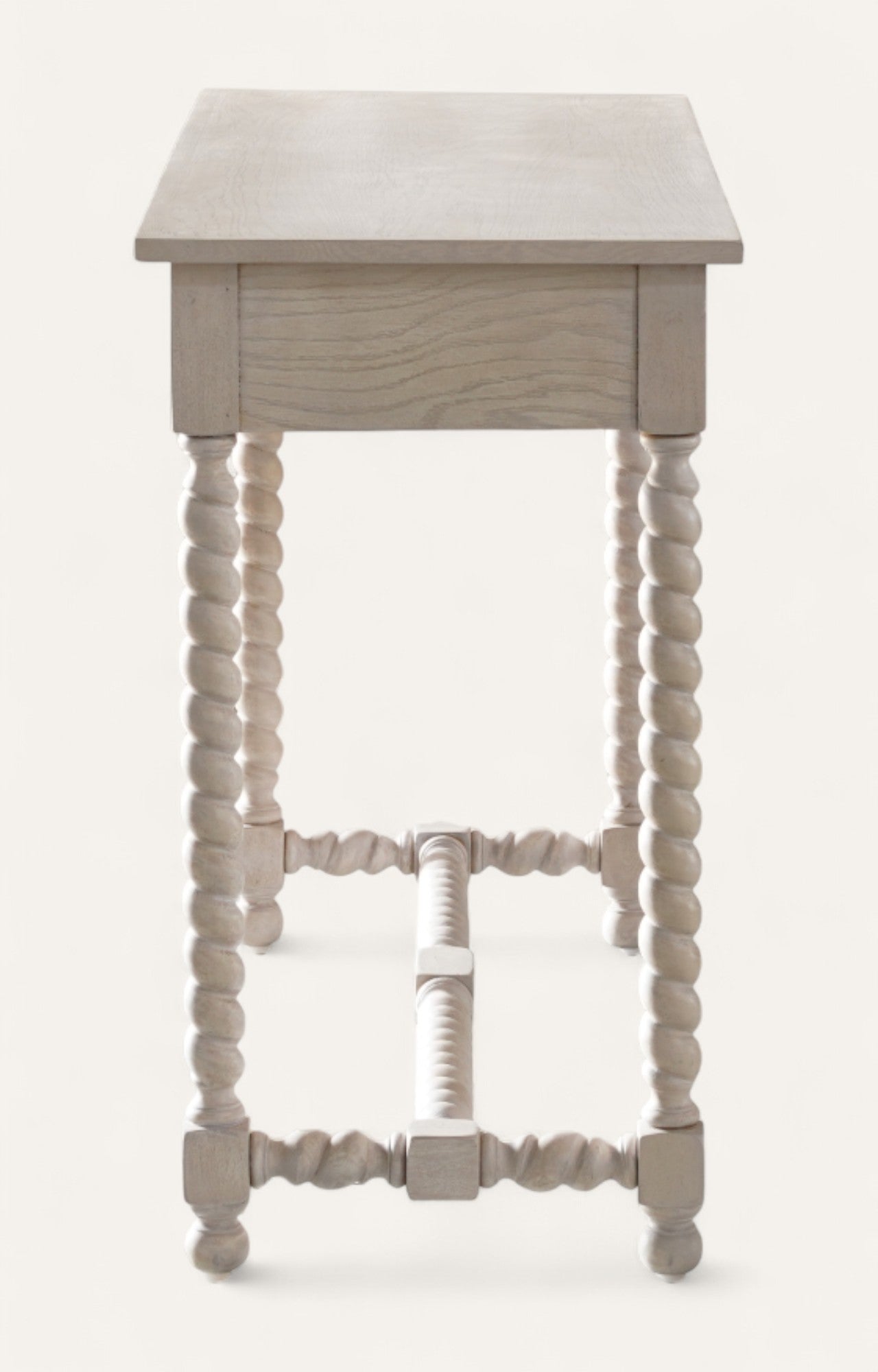 This study table features a classic and elegant design with a touch of vintage charm. It is crafted from wood with a light, washed finish that highlights the natural grain. It includes two slim front drawers with simple round knobs for storing stationery and small essentials. Compact yet stylish, this desk blends functionality with timeless craftsmanship, making it a refined choice for a study room, bedroom, or home office.
