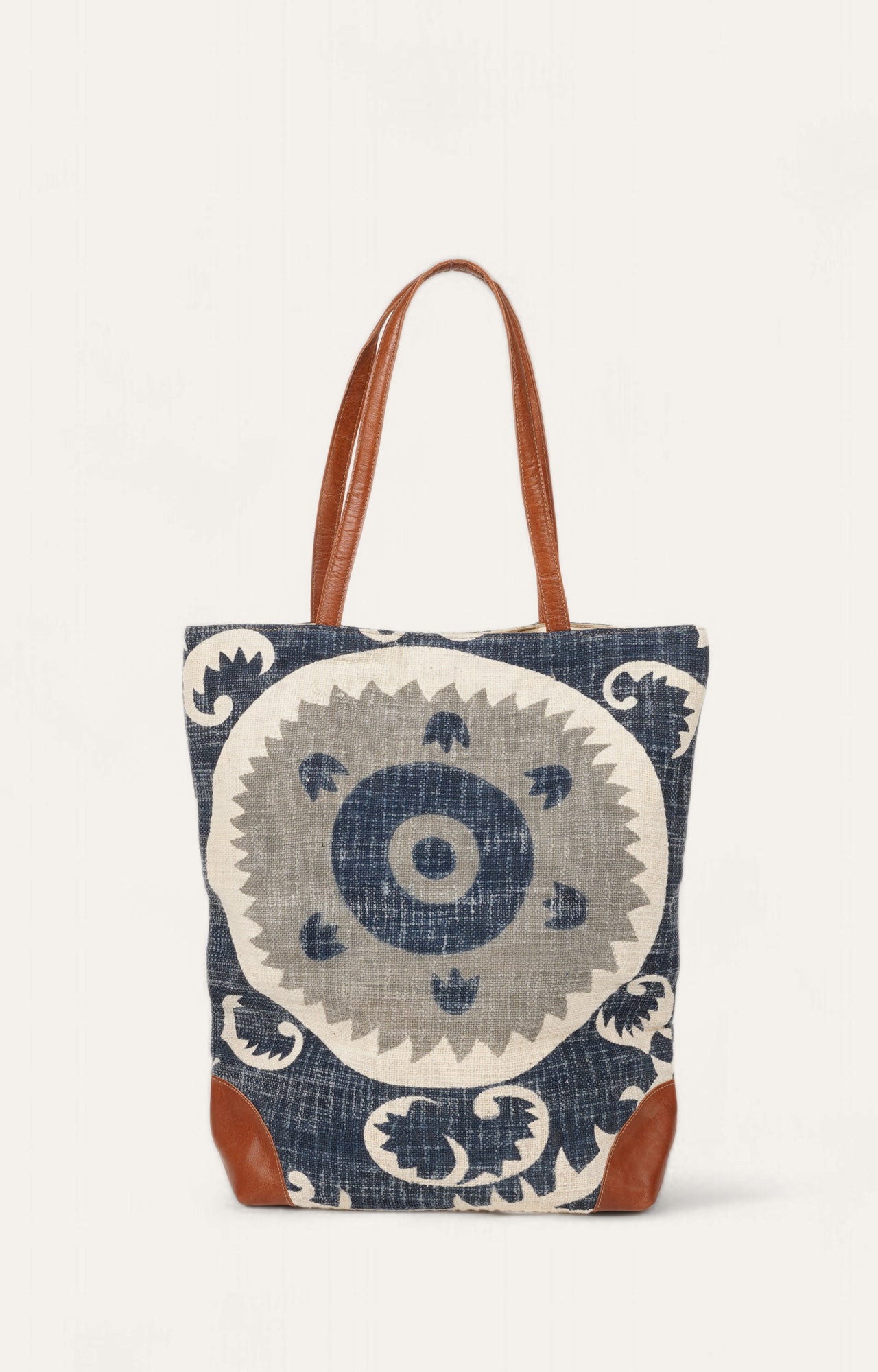 > Made from handwoven cotton dhurrie paired with durable suede leather straps.
