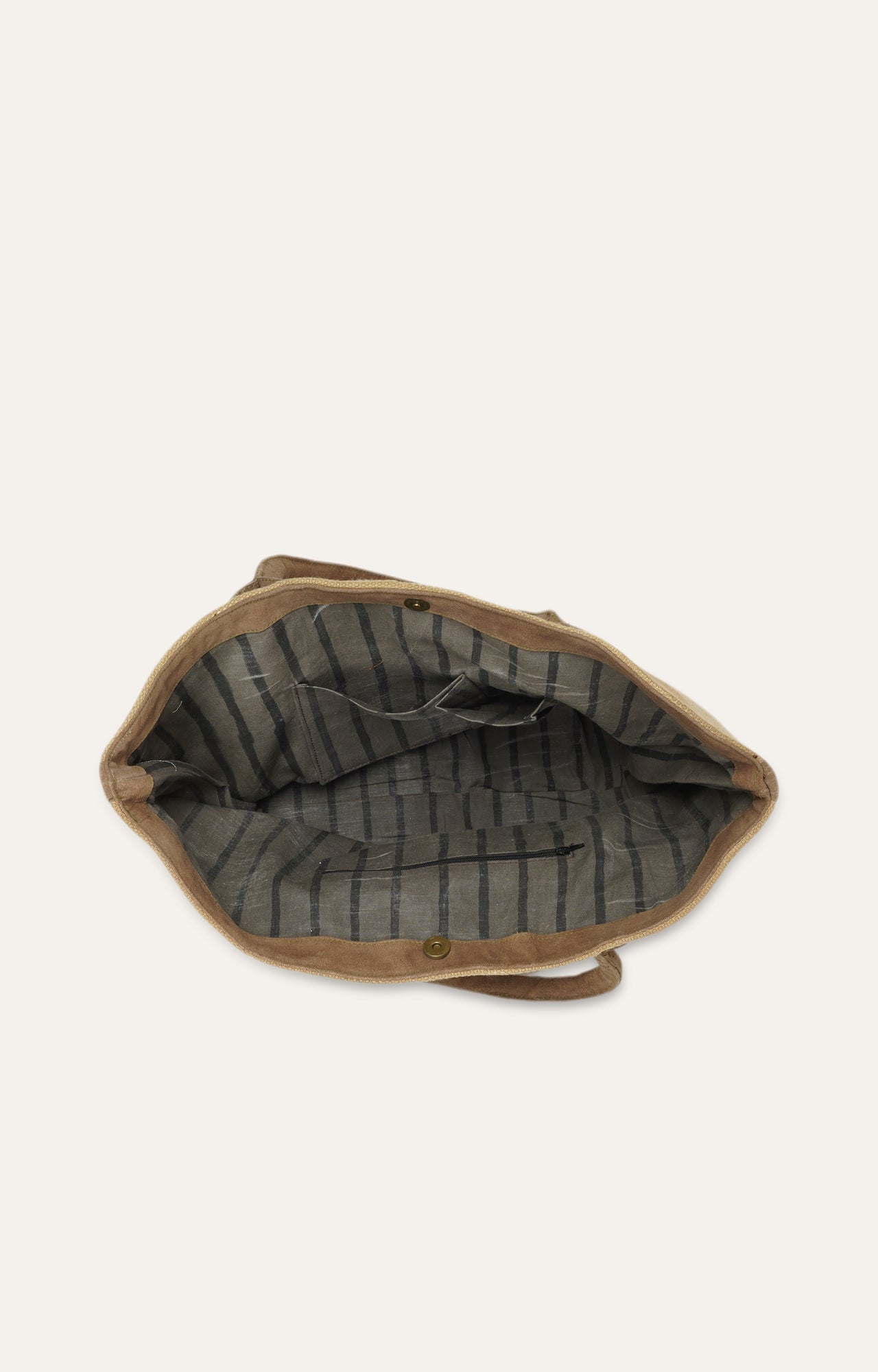 This elegant earthy brown tote bag exudes simplicity and versatility, making it the perfect accessory for any occasion. Crafted from handwoven cotton dhurrie, this bag is complemented by sturdy suede leather straps for added durability and comfort. Its neutral brown tone allows it to pair effortlessly with a variety of outfits, whether for work, travel, or casual outings.