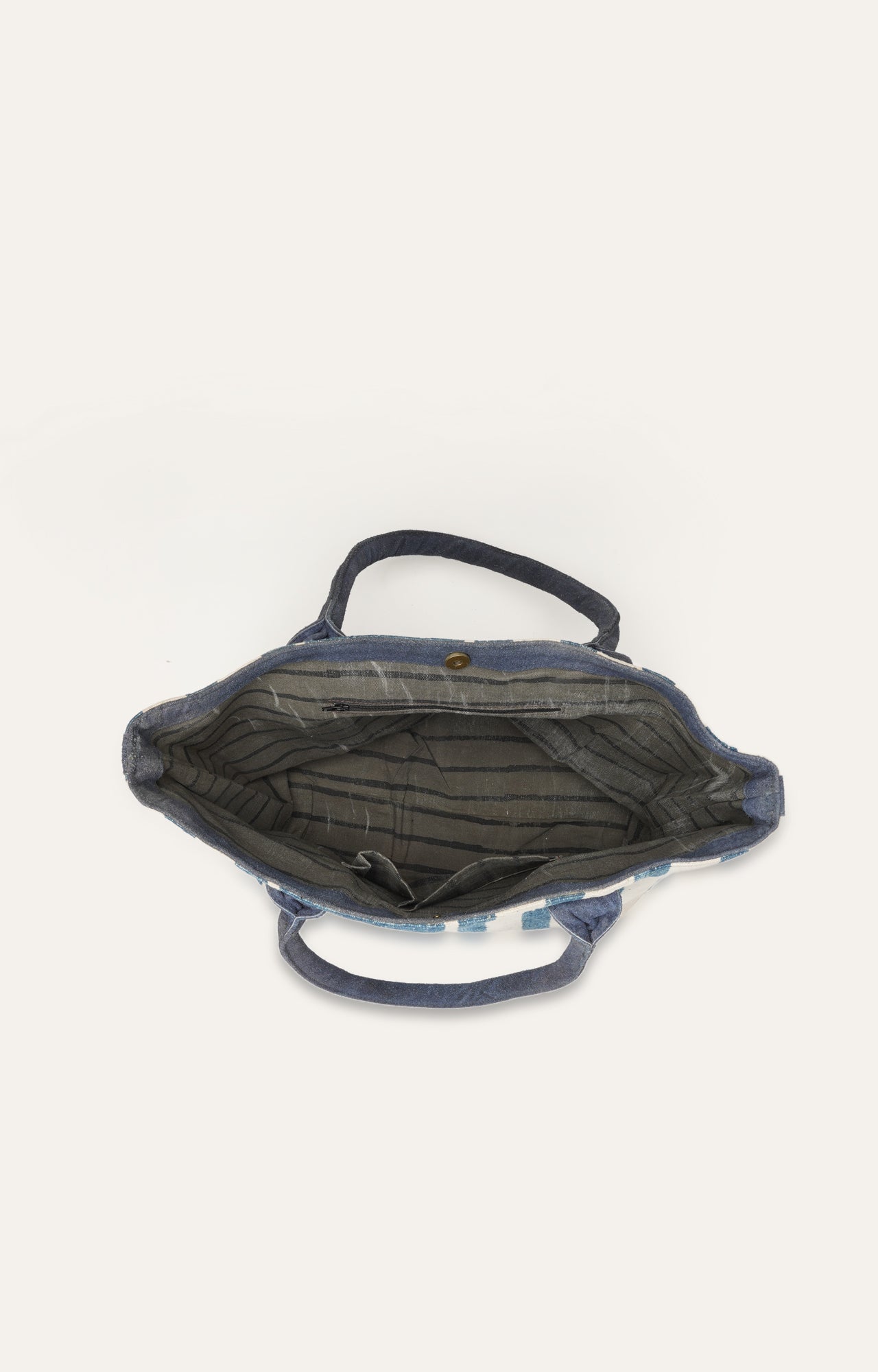 This chic eco-friendly tote bag features a bold striped design in indigo blue and off-white, adding a modern yet traditional touch to your accessories. Crafted from handwoven cotton dhurrie fabric, it combines durability with a stylish look. The suede leather handles ensure comfort and strength, making it the perfect choice for both everyday errands and casual outings.