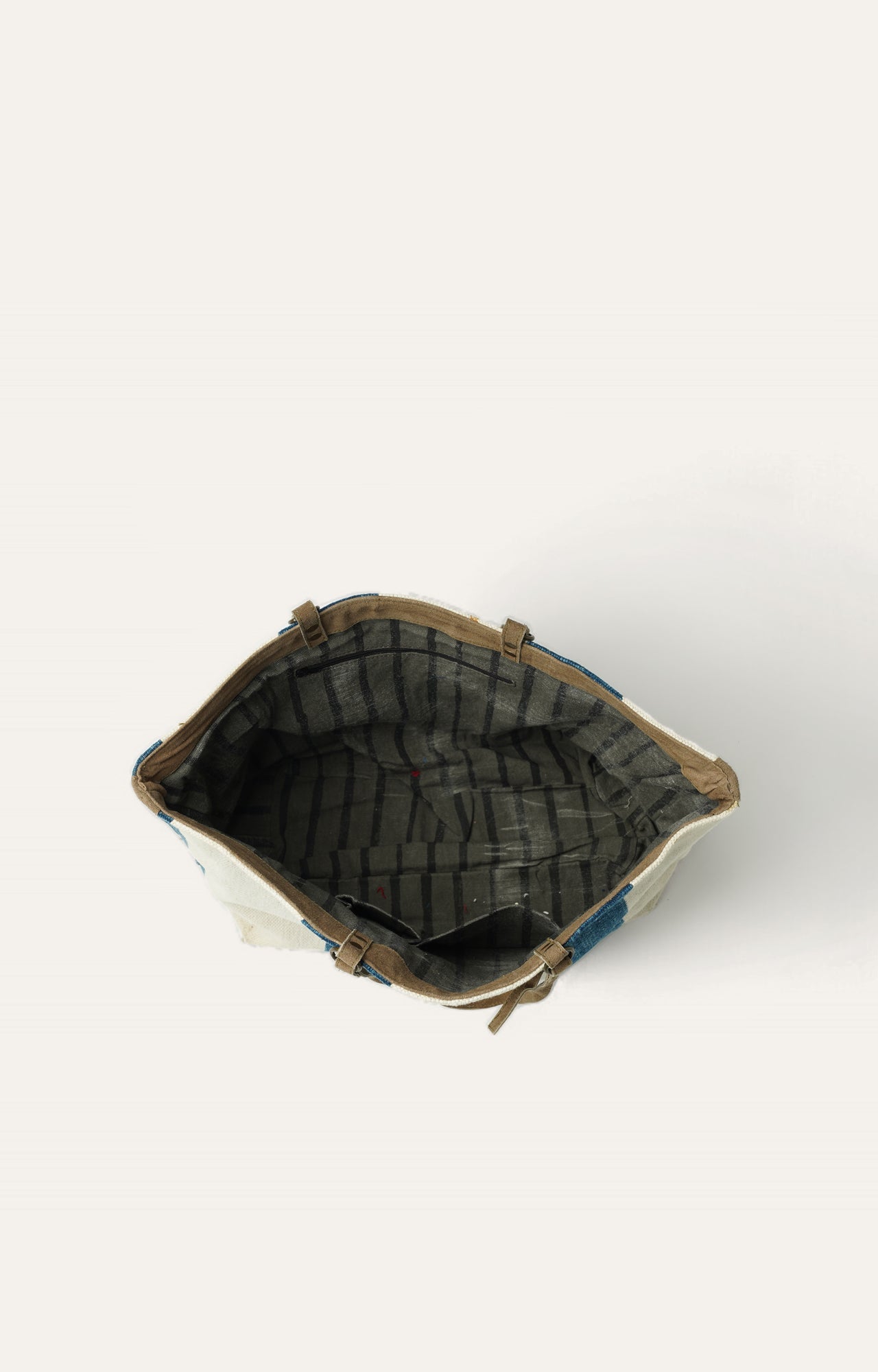 This beautifully crafted tote bag is made from eco-friendly handwoven cotton dhurrie fabric. The sturdy suede leather straps provide comfort and durability, making it an ideal companion for your daily errands or weekend adventures.