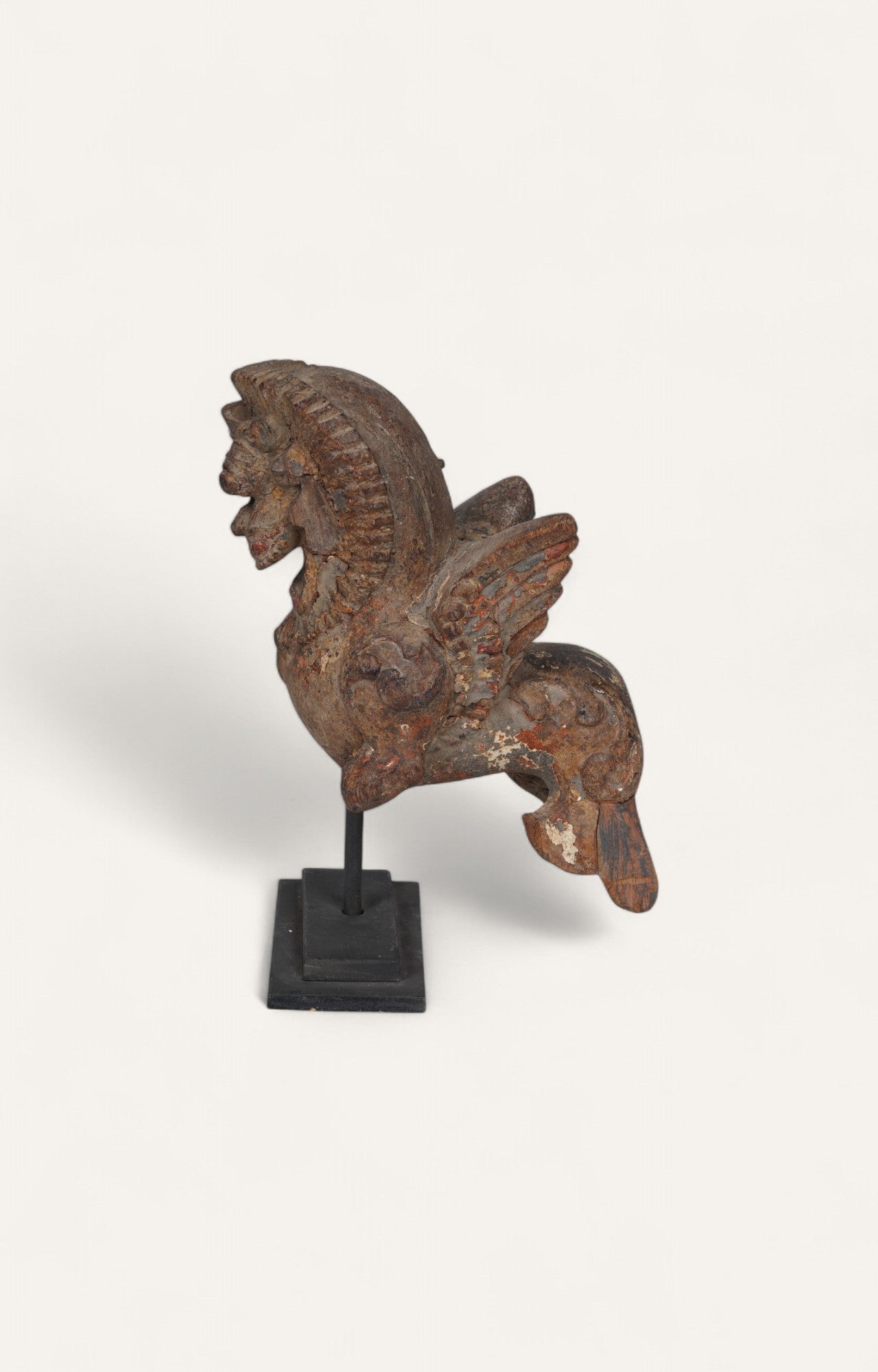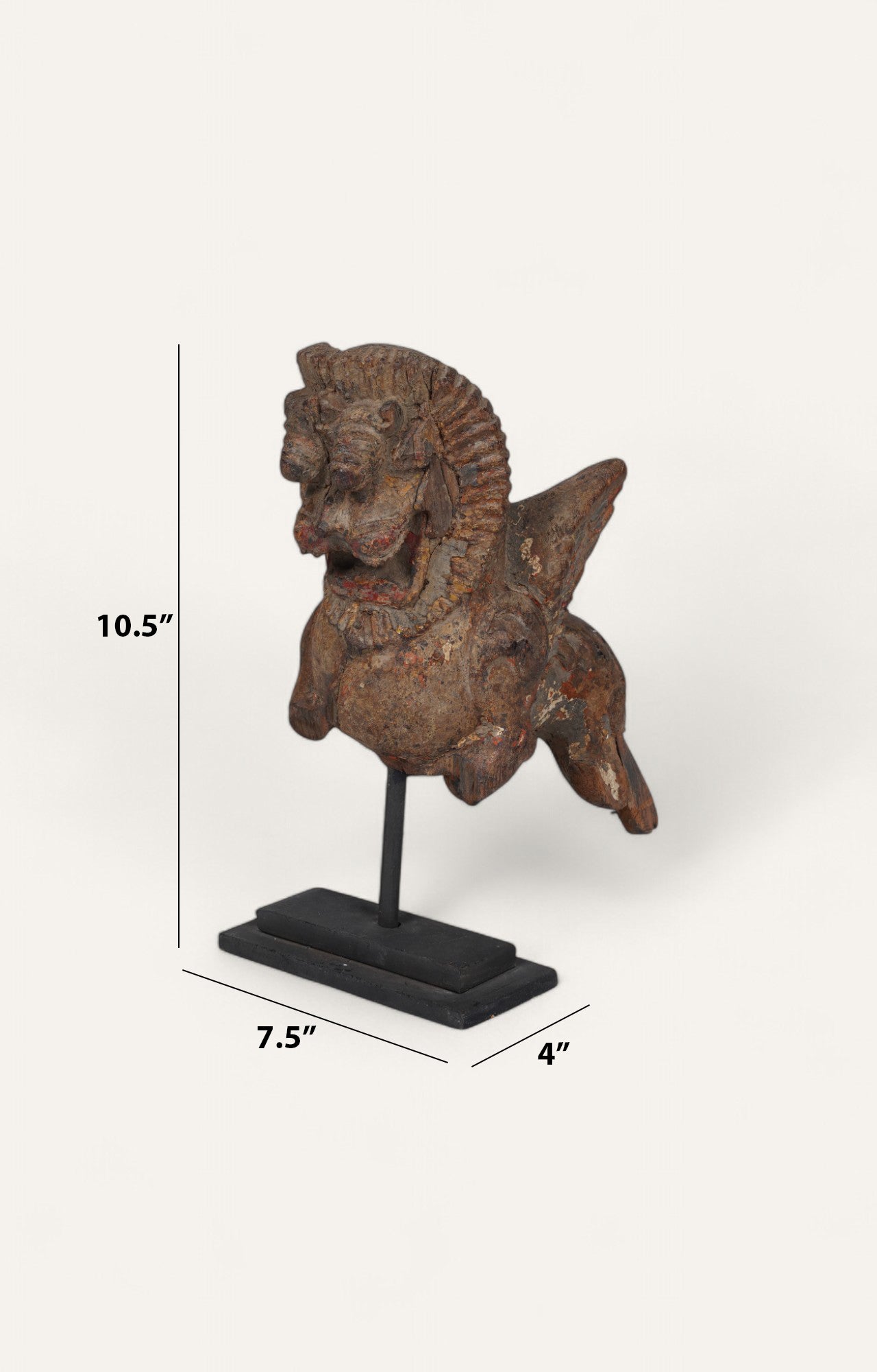 A compelling relic of Himalayan traditions, this hand-carved Tibetan guardian is modelled in rich teak wood and mounted on a plain iron base. The stylized shape, weathered finish, and traces of vermilion pigment testify to devotional origins and ritual use. Being both sculptural and symbolic, it is an imposing artefact that exerts presence on consoles, mantels, or pedestal stands.