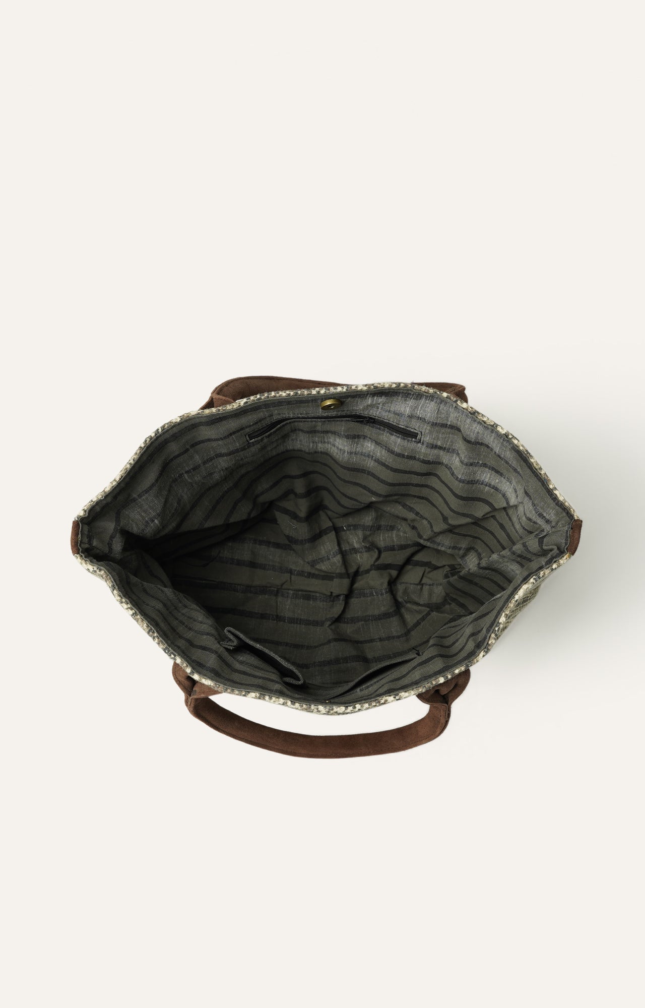 > Made from handwoven cotton dhurrie paired with durable suede leather straps.