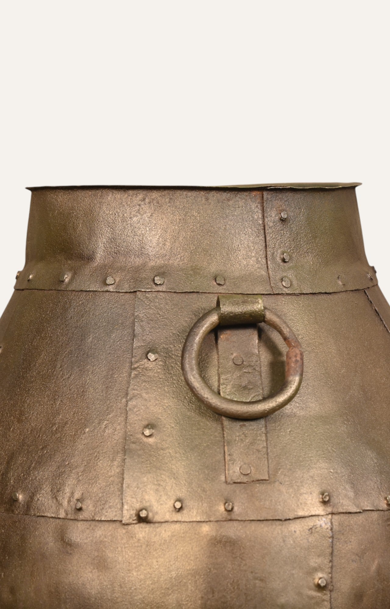 A vintage solid metal pot in a golden finish, featuring a traditional patchwork design with rivet details. The metal ring handles add to its functional appeal, making it a versatile piece for both décor and utility.