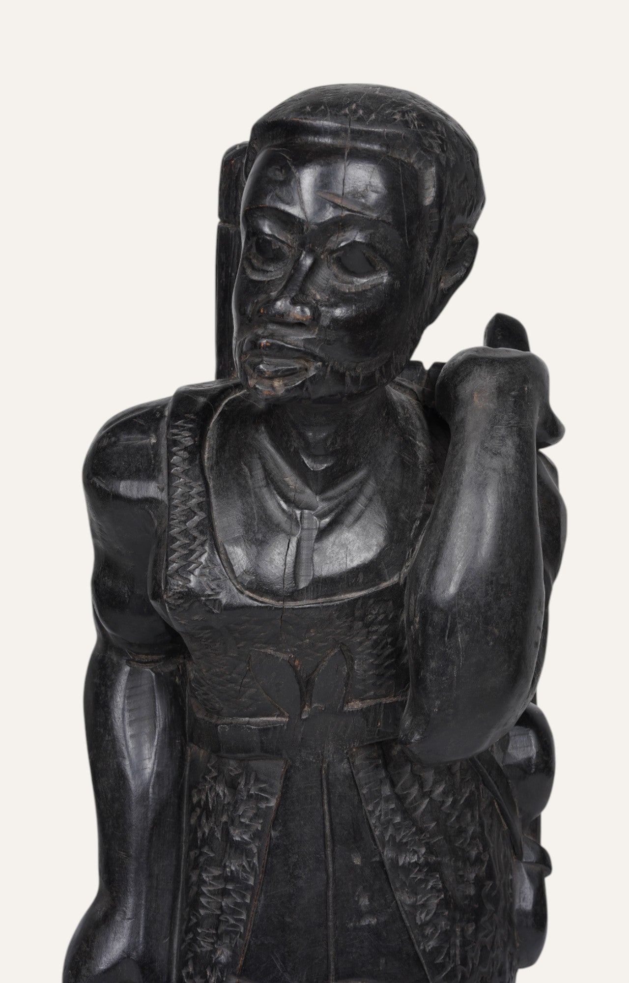 Dignified and commanding, this high-standing tribal sculpture showcases a protector figure alongside a faithful pup. Delicately carved in teak wood, its shape is highlighted by an ebony-black finish and shell-inlaid base. Get this stunning cultural artwork for console placements, entrance niches, or art-inspired corners.