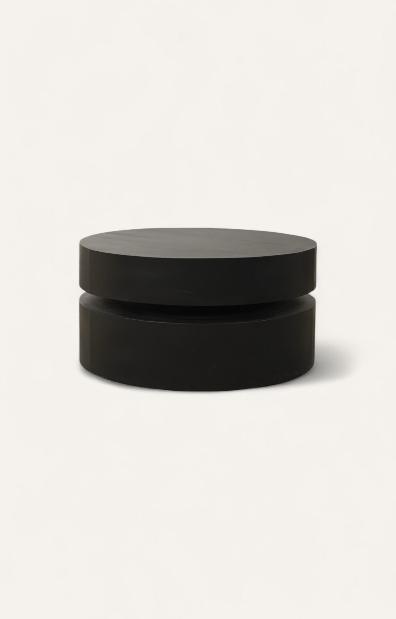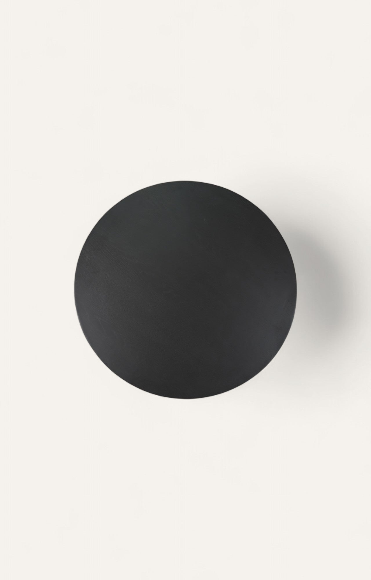 Distinguished in terms of form and functionality, this two-tier circular coffee table is made of oak veneer and finished in a matte black hue. The plain disc-like form conceals a minimalist floating tier, thus serving as a focal point for modern, minimalist, or industrial-concept living rooms.
